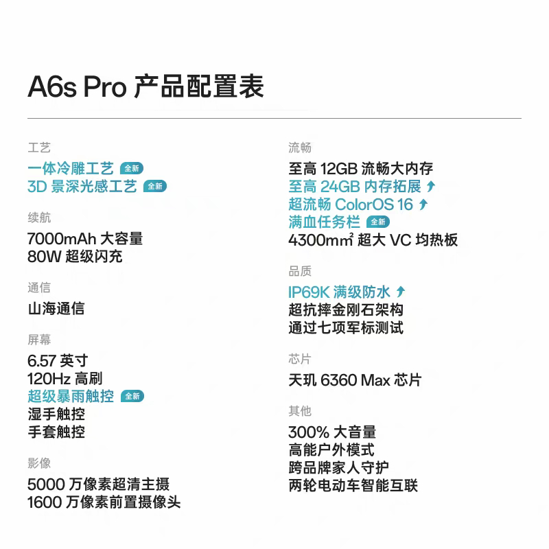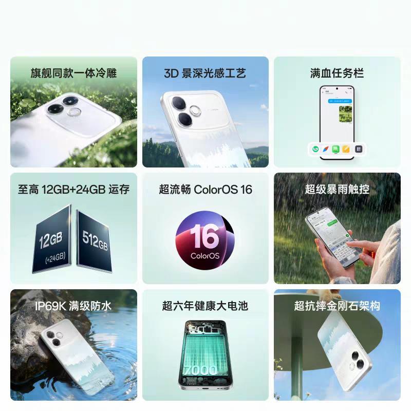 5.其他:ColorOS 16,屏下指纹,全场景NFC,山海弱网通信,超抗摔金刚石架构,300%音量,IP66/68/69/69K满级防水,青云直上、好运莲莲、夜月生辉三色,8+128GB 2199元起!