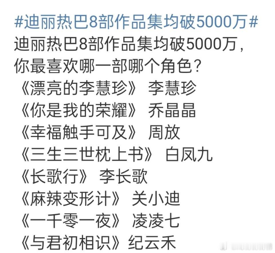 迪丽热巴8部作品集均破5000万这都是前几年的作品呀,近几年的基本上都扑了,白日