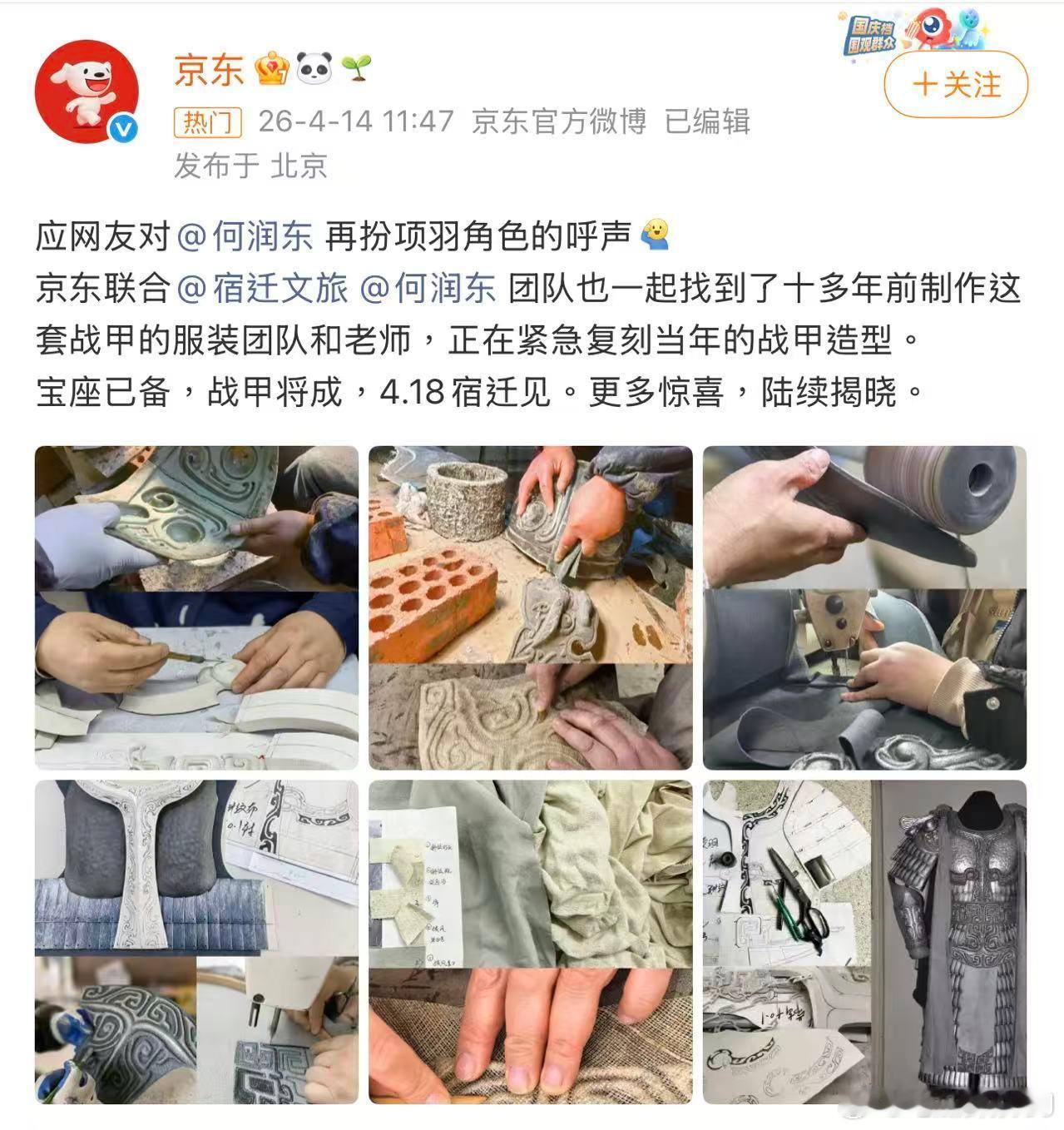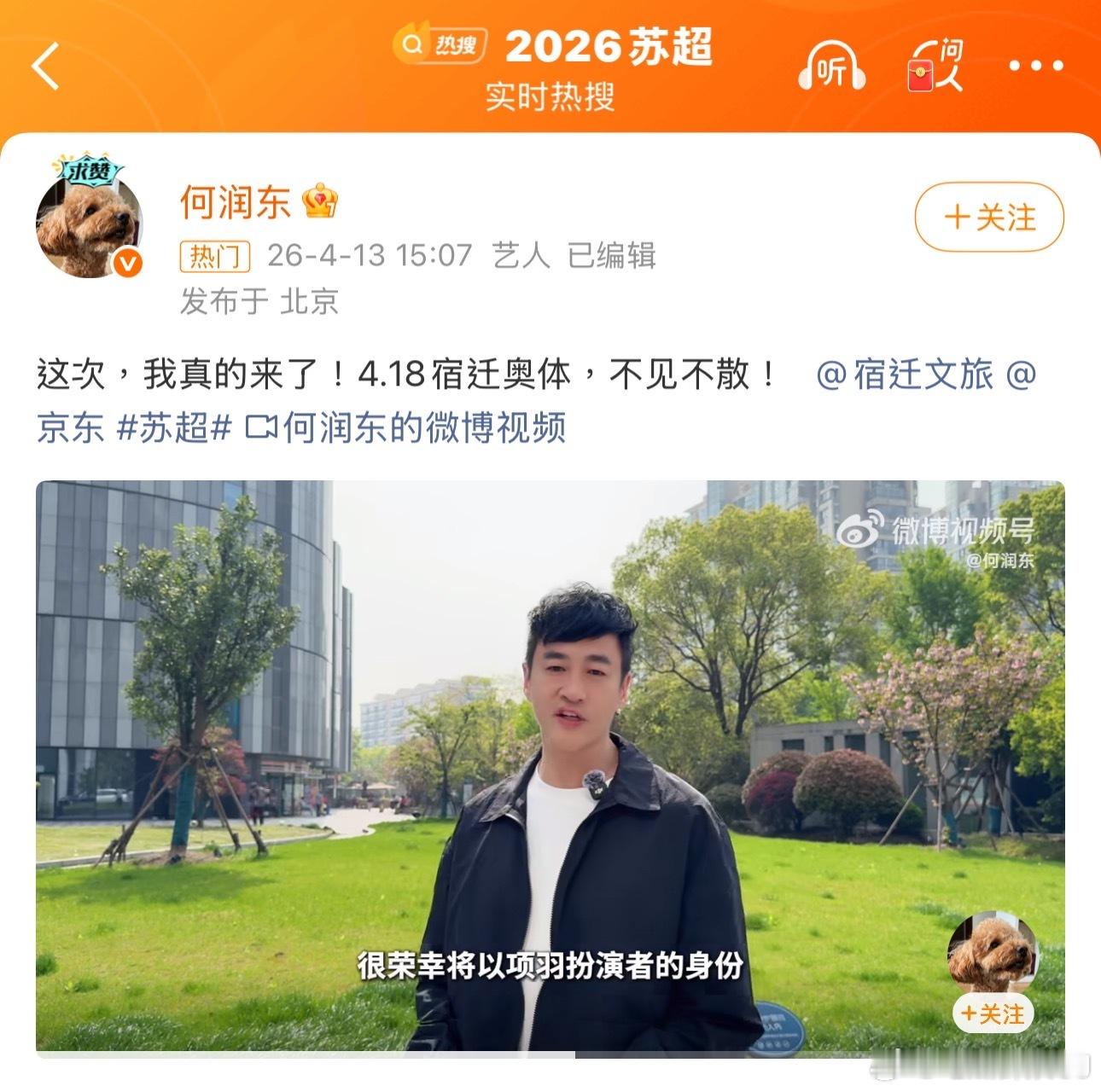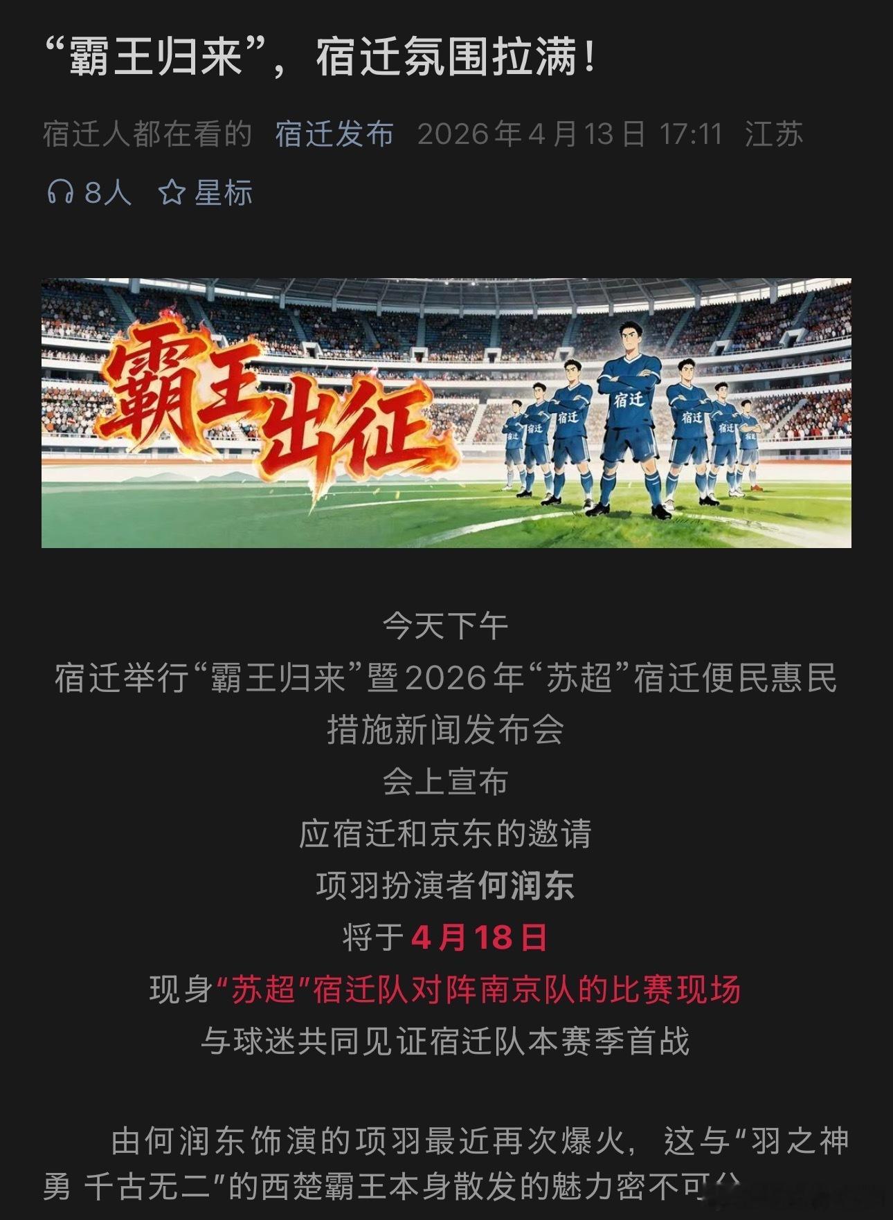 宿迁文旅不仅邀请他现场观战苏超联赛宿迁对南京,赞助商还特意还原了当年的战甲戏服,要他扮成项羽亮相。