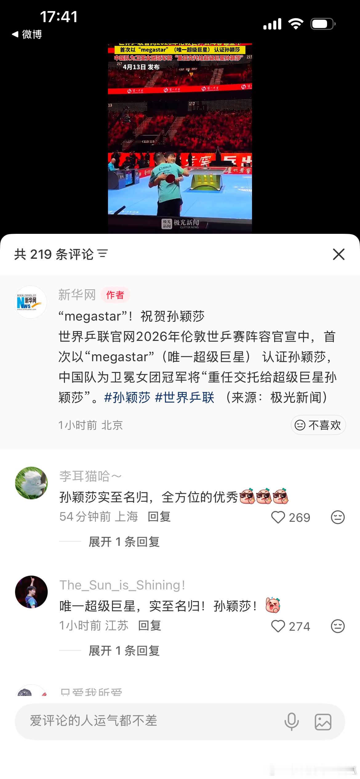 世界乒联正式发文认证超级巨星孙颖莎。世界乒联正式发文认证超级巨星孙颖莎。孙颖莎