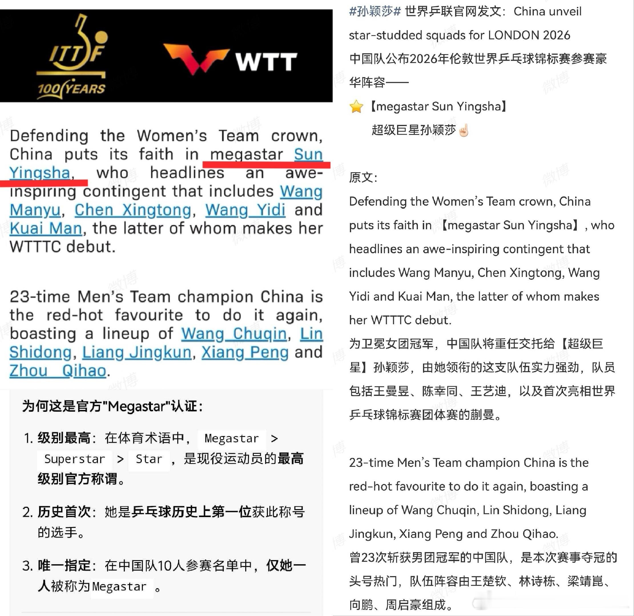 国际乒联官宣伦敦世乒赛阵容,直接盖章孙颖莎"megastar"megastar「