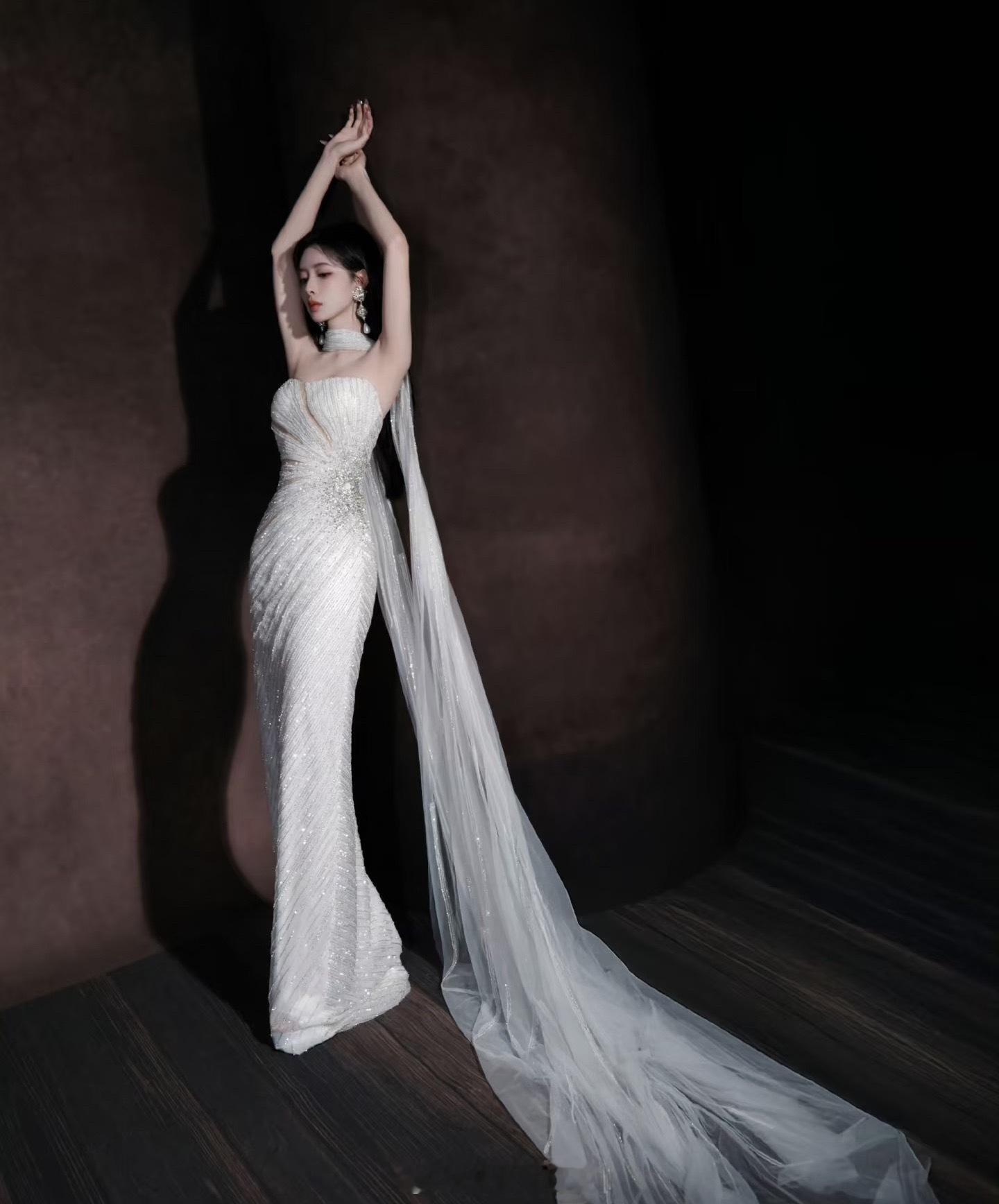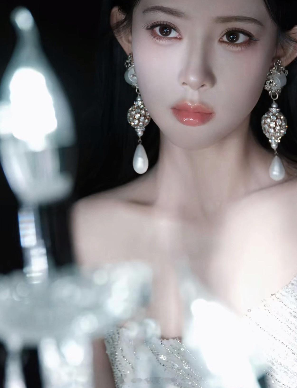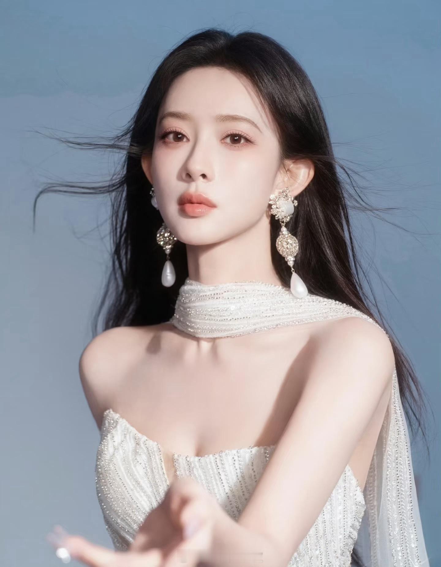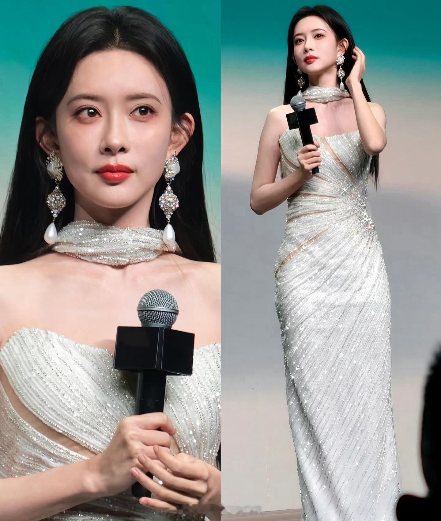 孟子义摘耳环孟子义黑长直➕白色抹胸长裙好美,今天是女神!孟子义摘了耳环