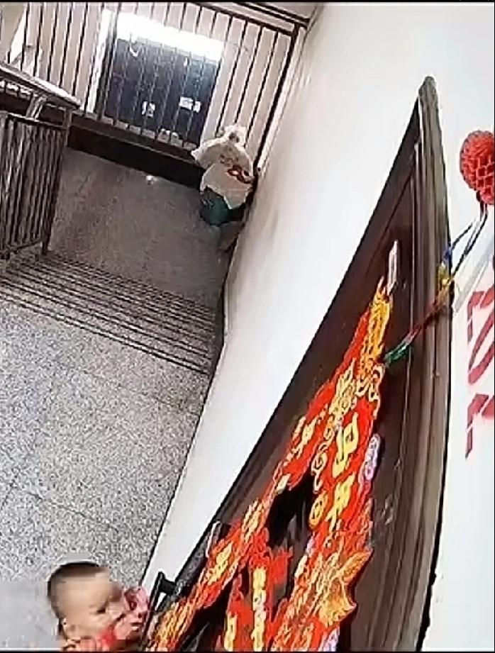 近日,内蒙古。爷爷奶奶在家里带2岁的宝宝。奶奶准备将垃圾放到门外。爷爷没注意宝宝跟在奶奶的身后。奶奶打开门,弯腰放垃圾时,宝宝也跟着出来了。奶奶放好垃圾,与宝宝完美错过,把门关上了。