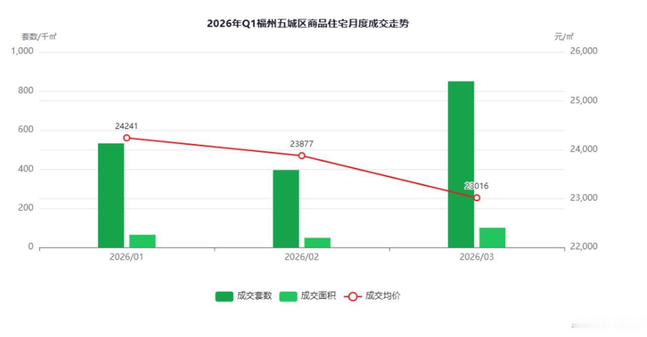数据显示,一季度福州商品住宅成交均价为23583元/㎡,同比下降3.19%,环比下降2.00%,价格调整幅度相对温和,未出现大幅波动。套均价约285万元/套,同比下降4.02%,环比下降1.06%。整体来看,市场价格呈现温和下行但跌幅收窄的态势,底部支撑逐步显现。