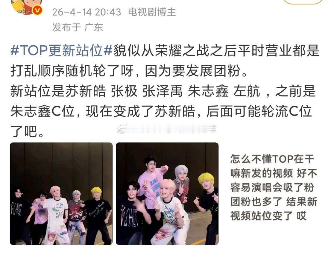 TOP新站位,苏新皓c位,朱志鑫粉丝在维全中。要求归还应有的c位待遇,拒绝模糊站位。 并要求开放单人外务,否则就放朱志鑫单飞 TOP更新站位