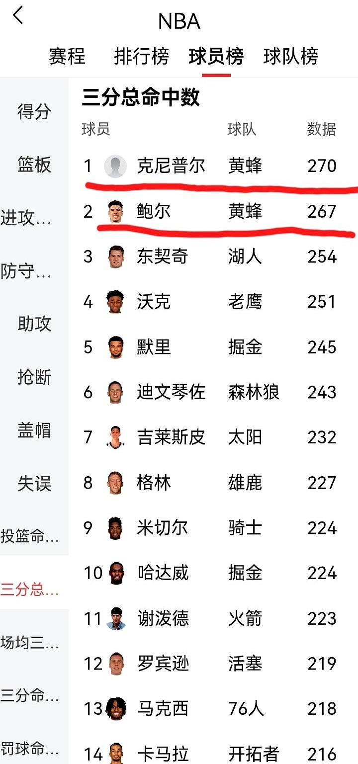 黄蜂队的拉梅洛·鲍尔和新秀康·克尼佩尔,去年就开始追分了。克尼佩尔去年达成100记三分,赛季总数273,飙到联盟第一。鲍尔相差1记,赛季刚投了272。今天的比赛,他拼到外线:“给我这个机会!”半场就投中4记,比分紧咬。克尼佩尔也不示弱,投中了2个篮板,最终赛季累计273,比鲍尔多一记。比赛还在走,谁能笑到最后,悬念还在。两人都不想输,一个是天赋少年,一个是队内核心,但都在这场对决中飙得热火朝天。
