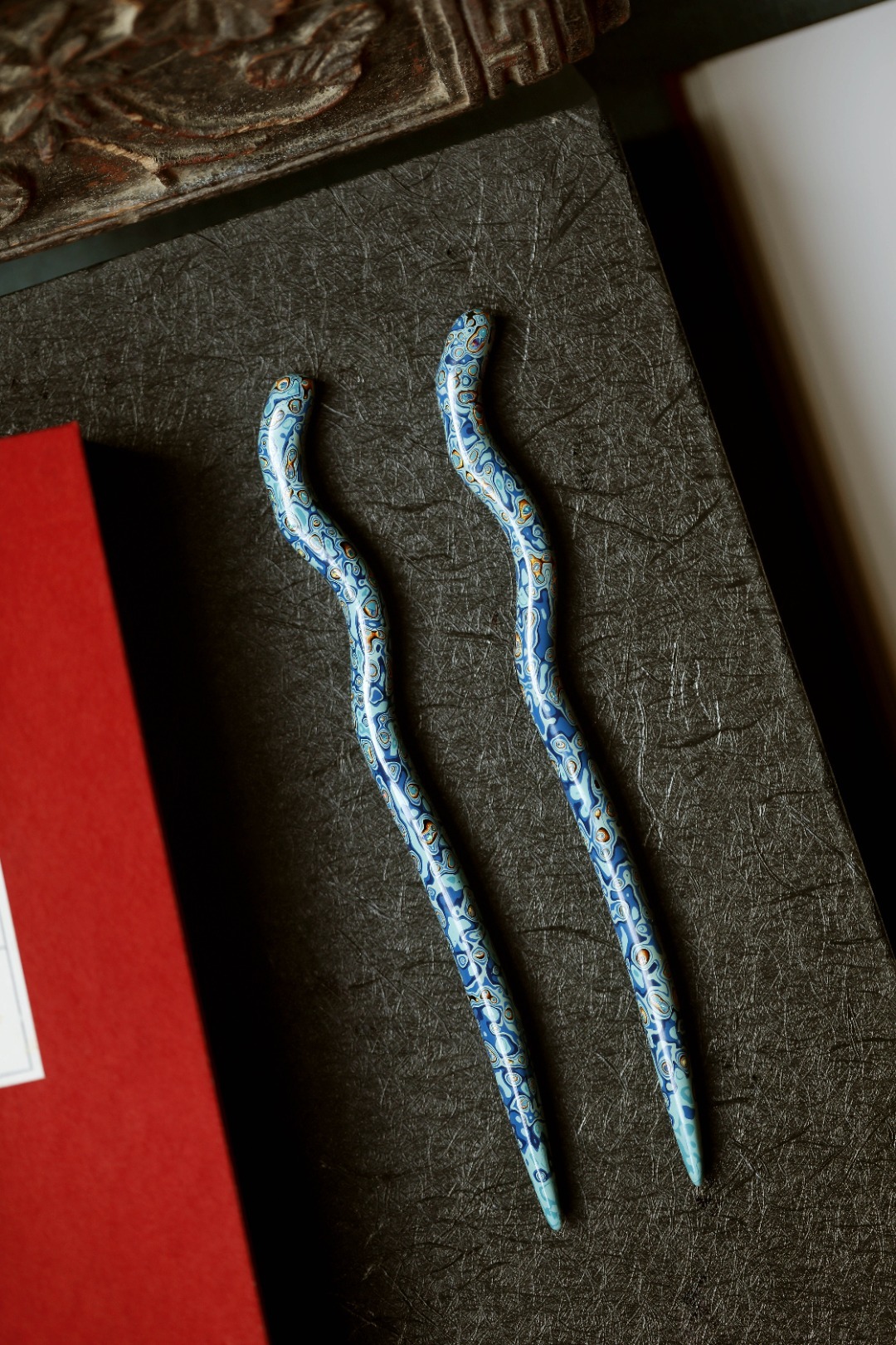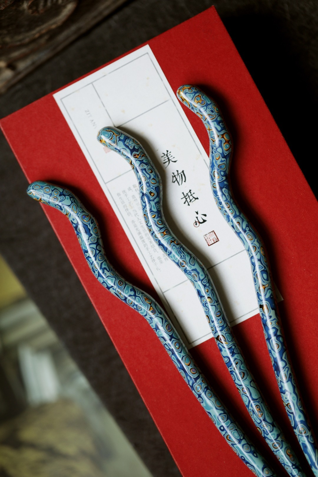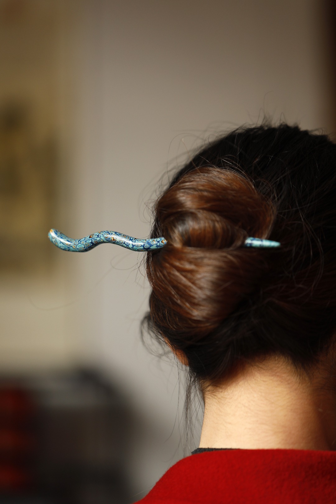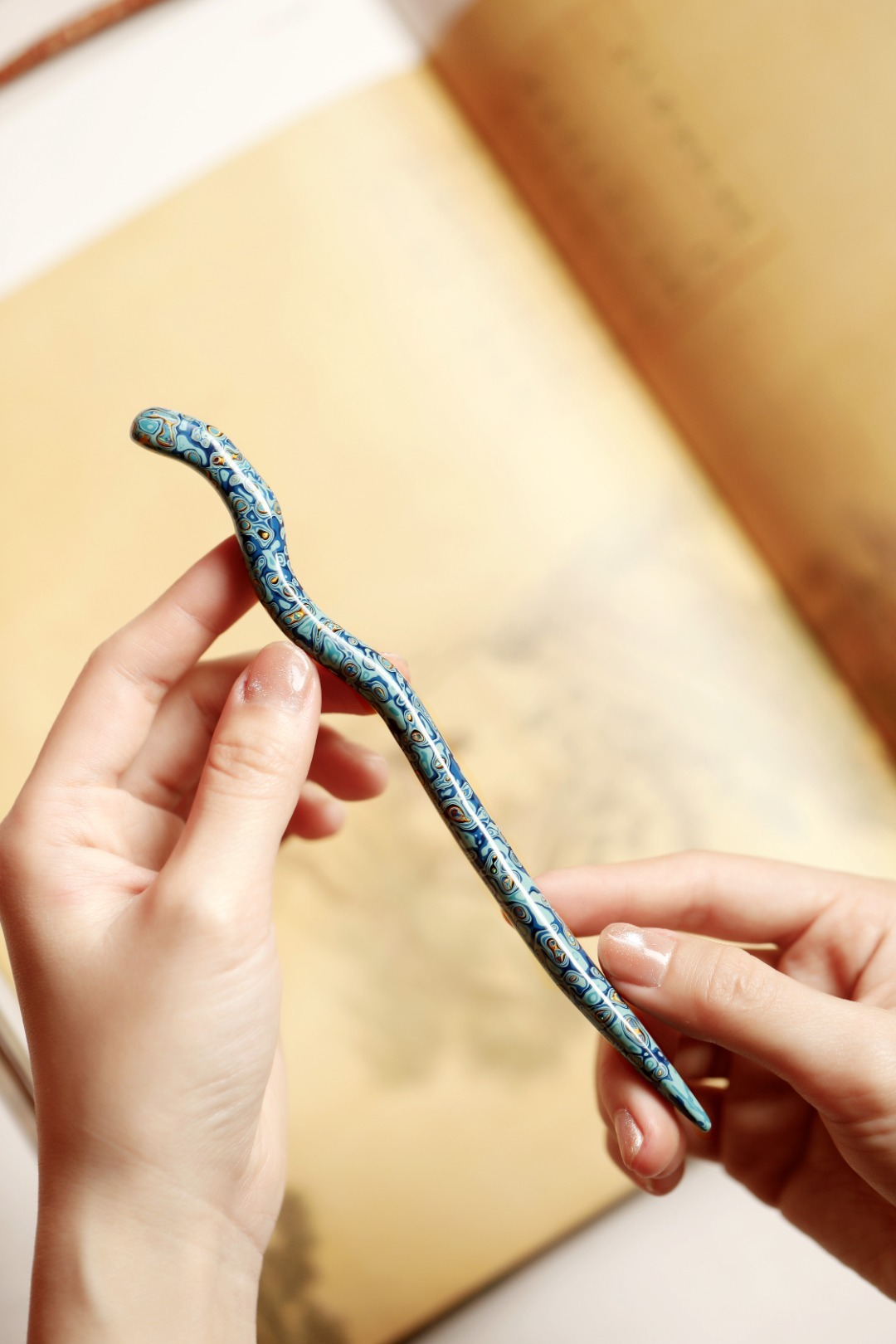 大漆【青蓝】发簪以紫光檀为胎体,线条流畅,外壁髹饰非遗大漆,层层打磨,戴上发簪的