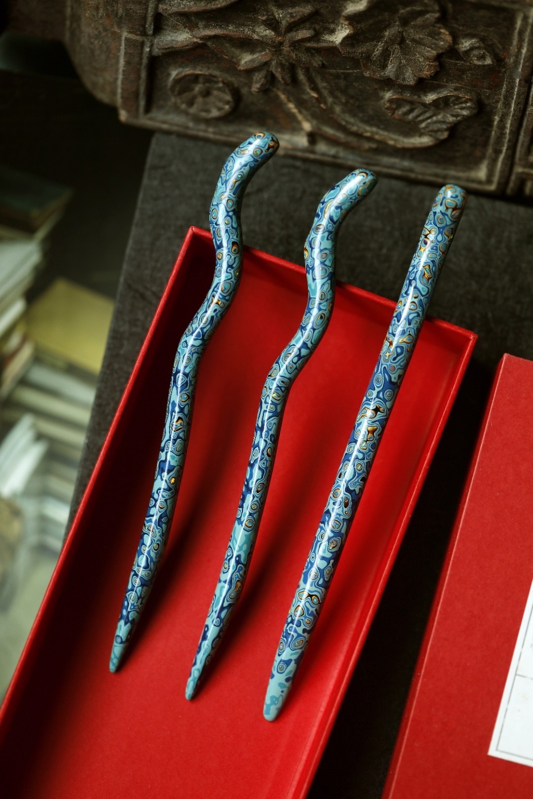 以紫光檀为胎体,线条流畅,外壁髹饰非遗大漆,层层打磨,戴上发簪的那一刻,芳华始现,明艳夺目。
