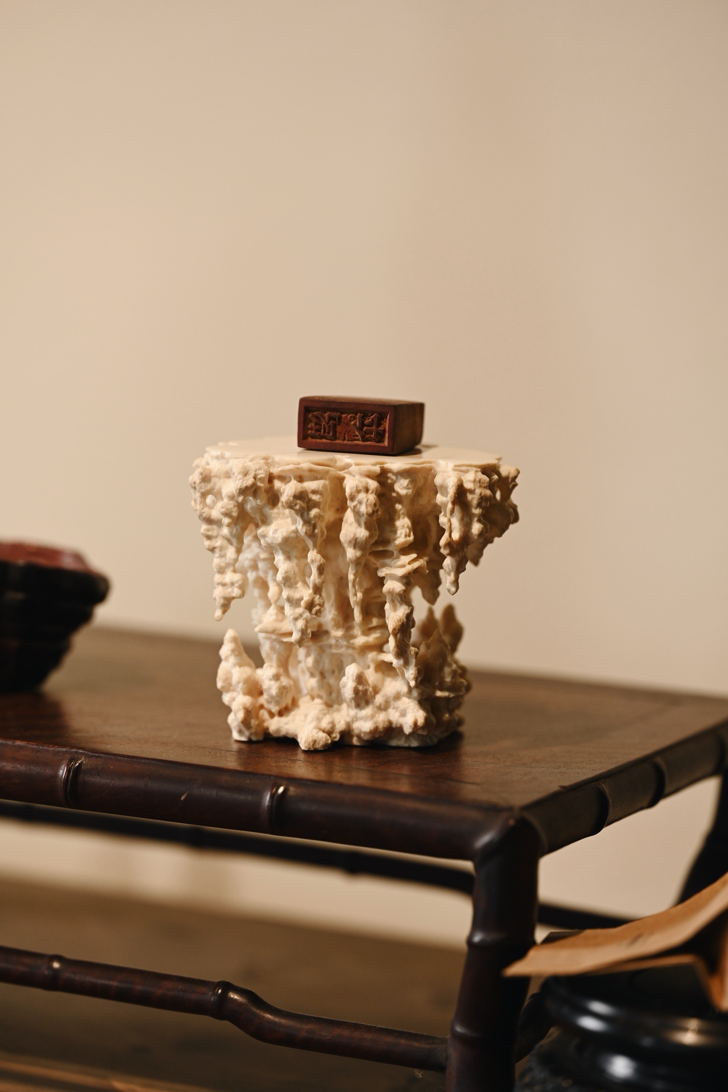 取料上乘,依料就势,造型稳重大气,镂空细节疏密有致,雕刻层层叠叠肌理展现石之苍劲嶙峋,陈设案头承托雅器,古朴大方。
