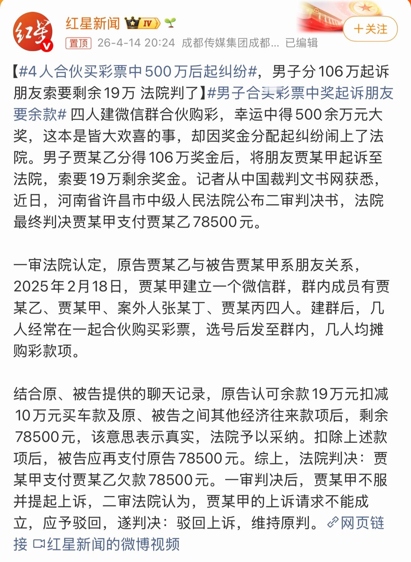 4人合伙买彩票中500万后起纠纷说到底,人性经不起金钱试探,彩票中奖就是人性试金石。平时称兄道弟、酒肉情分,在真金白银面前不堪一击,立马暴露自私贪婪的底色。合伙做事别信口头承诺,白纸黑字才靠谱。别高估人性、低估利益,钱却足以碾碎普通人的所有情义。