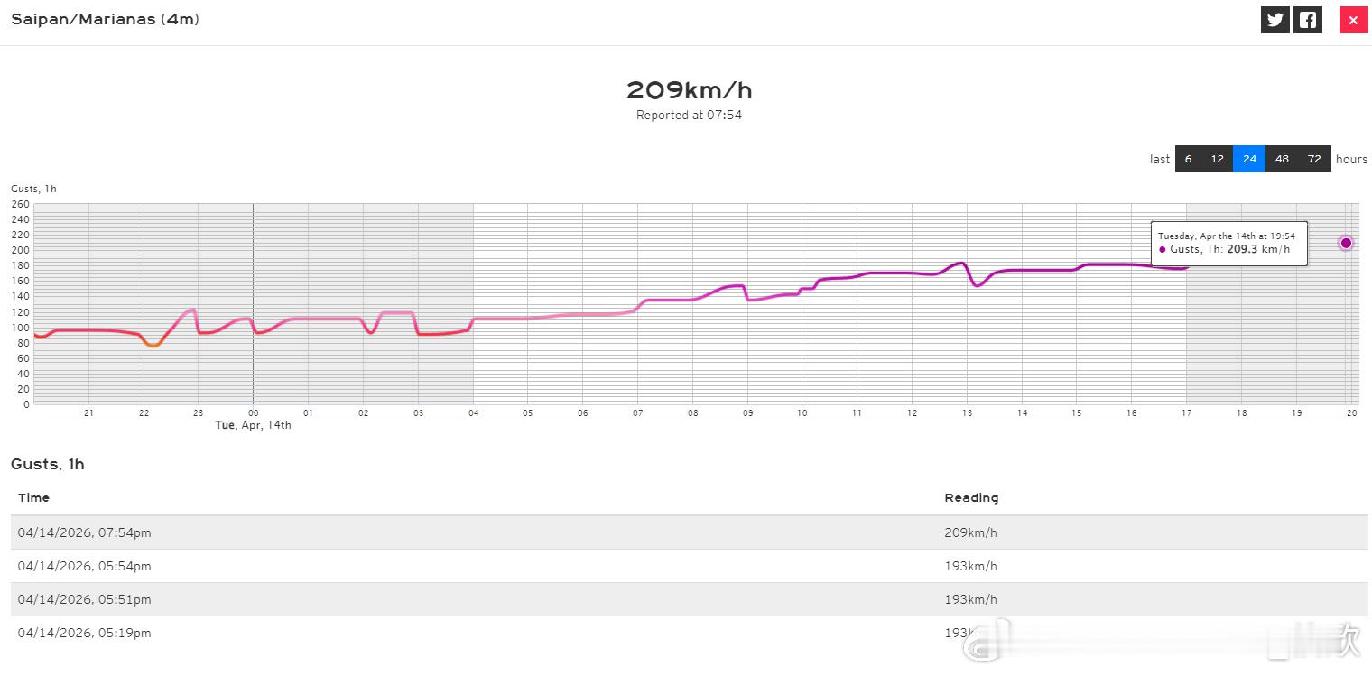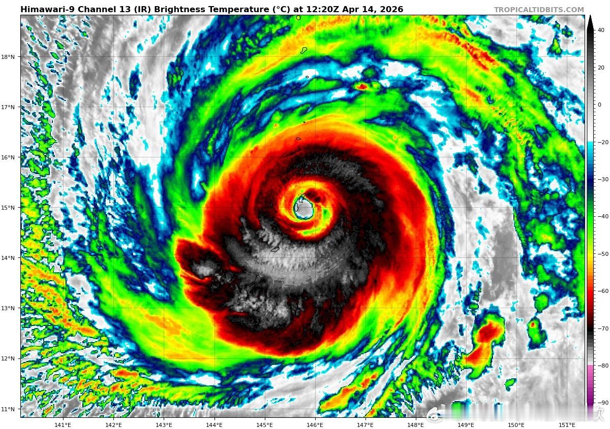 【超强台风森拉克】今晚20时,中央气象台给出森拉克强度评价为55米/秒,925百帕。从云图看,塞班岛已经处于台风眼壁区北侧,观测到了209公里/小时,也就是58米/秒(17级)的阵风。