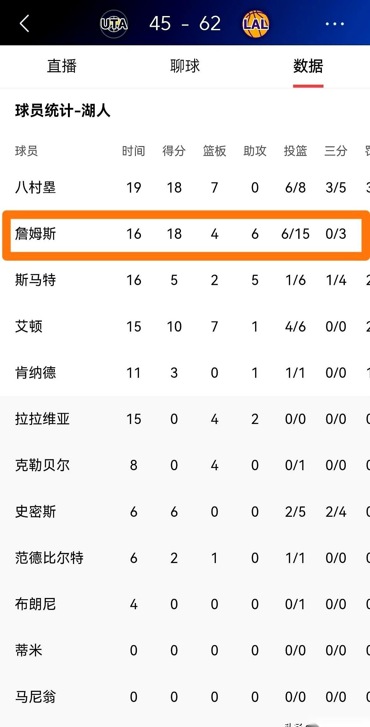 可你再一看比分牌,整个人都得站起来——湖人居然半场领先爵士17分。