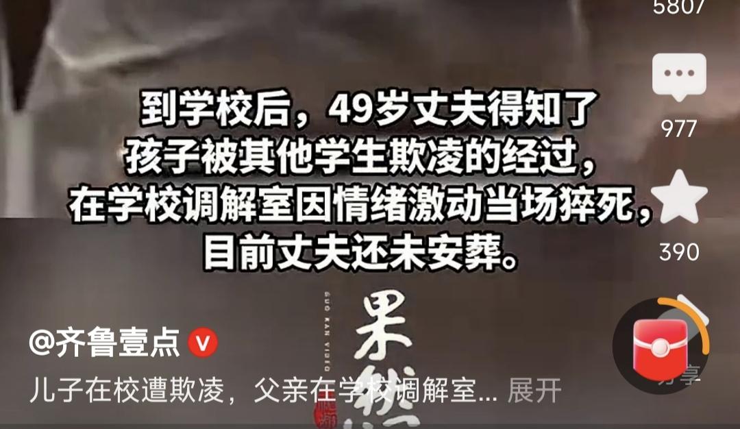云南49岁的男子得知15岁的孩子在校园被长期欺凌,被同学殴打,情绪激动导致猝死。我且不论这个父亲有什么其他疾病,是其他同学对他孩子的霸凌行为,导致了他离开这个人世间,而把孩子留在了这个人世间,这个可怜的父亲,不能在再守望,也不能再保护自己的孩子。