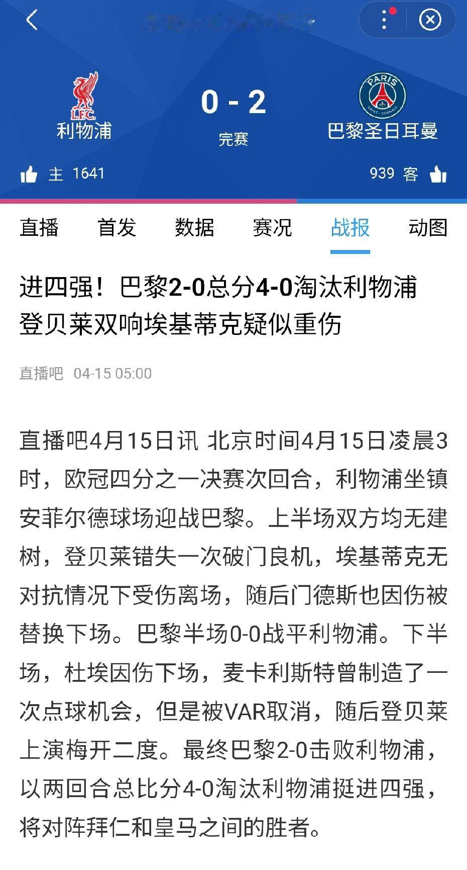 利物浦回到主场还是没有起色,0-2不敌巴黎,总比分0-4溃败无缘欧冠四强。