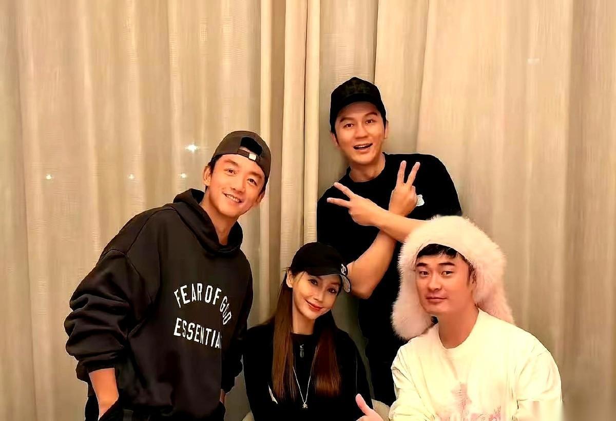 她一个人稳坐正中间,旁边三个男人,清一色黑衣黑帽,像三尊护法,把她牢牢圈在核心。李晨的黑T恤绷着线条,手还是万年不变的剪刀手。郑恺的卫衣帽子歪着戴,嘴角一咧,还是那个熟悉的劲儿。