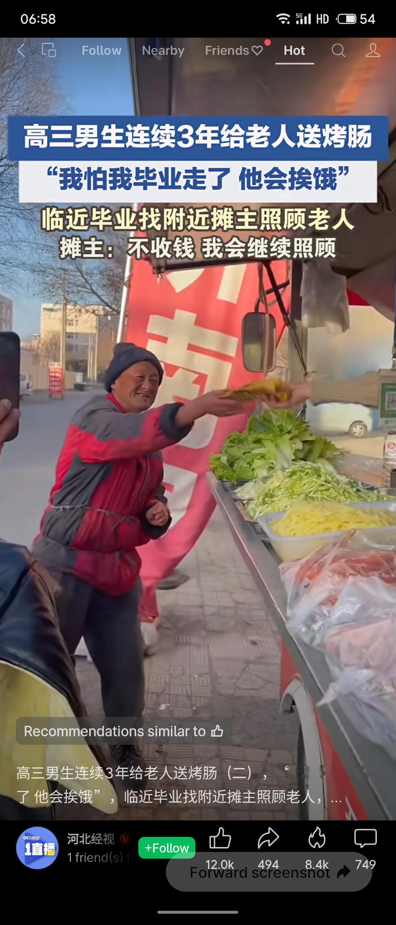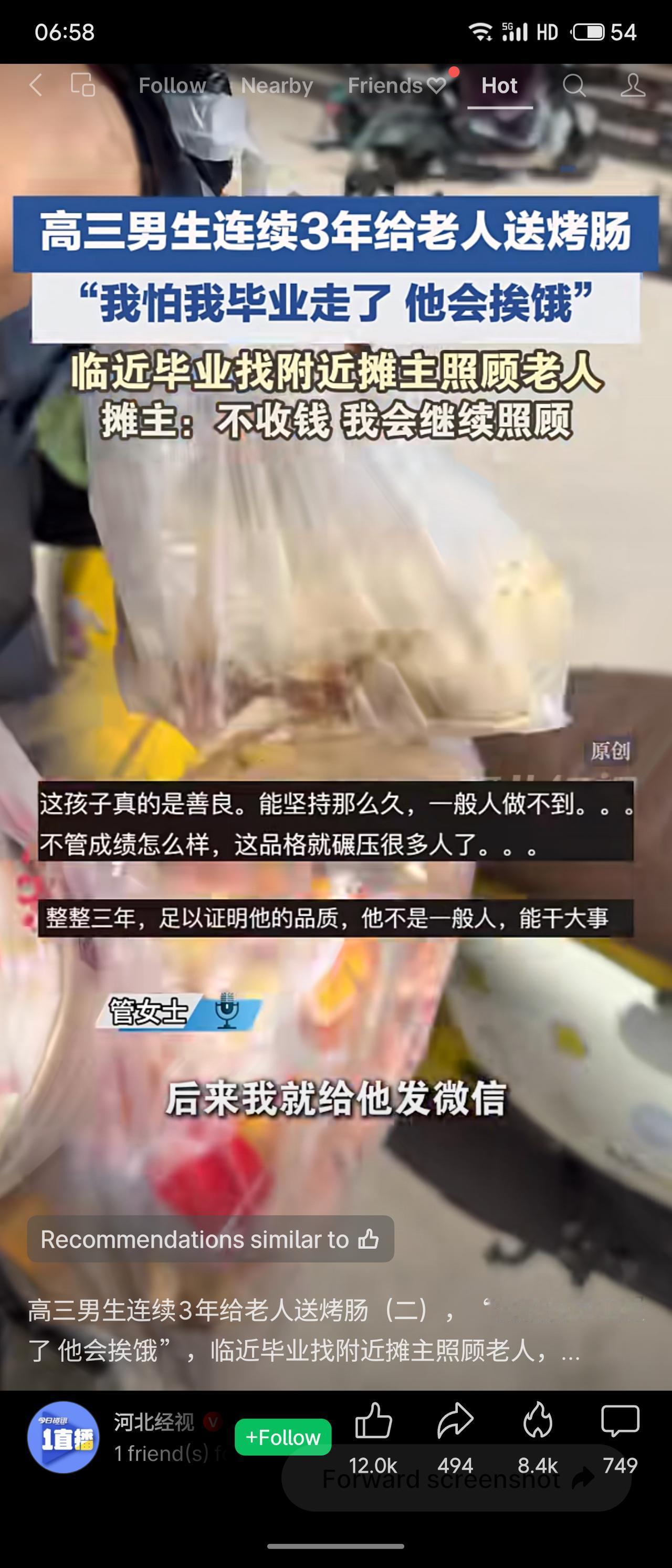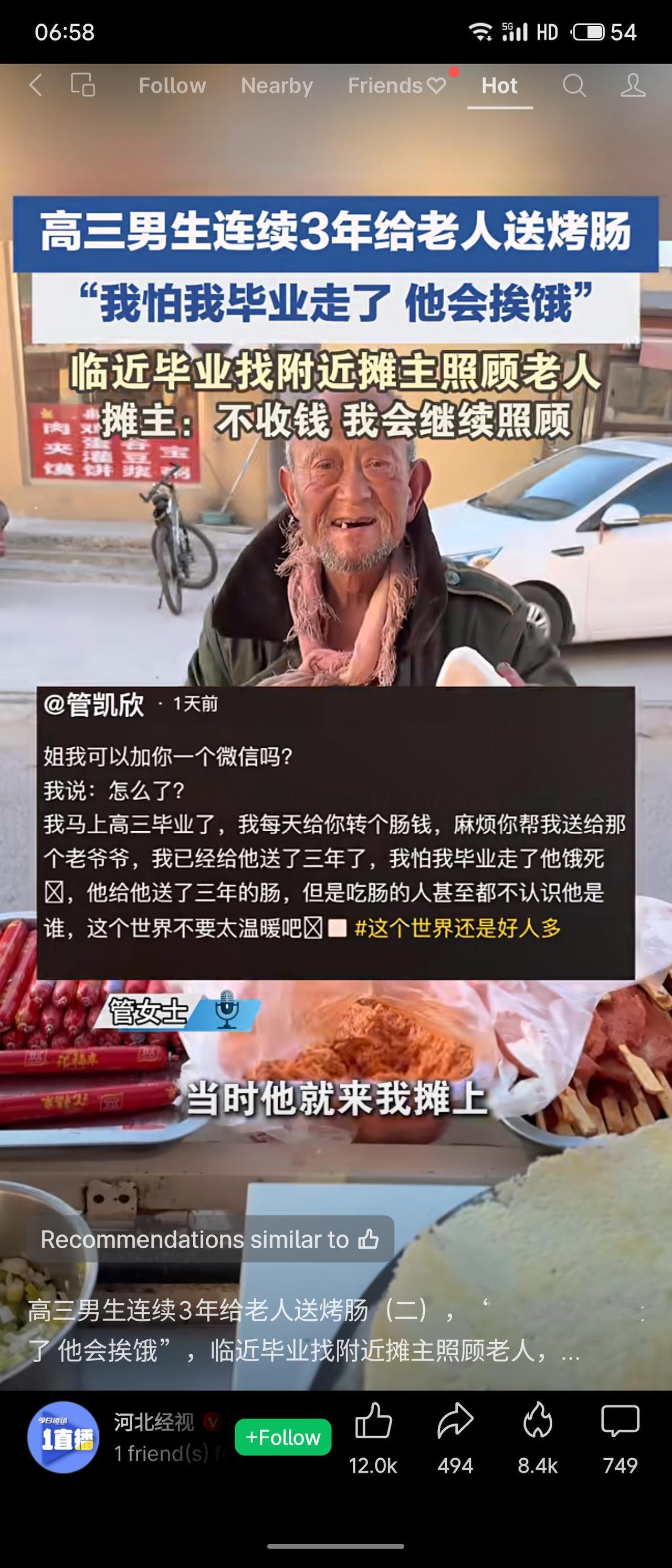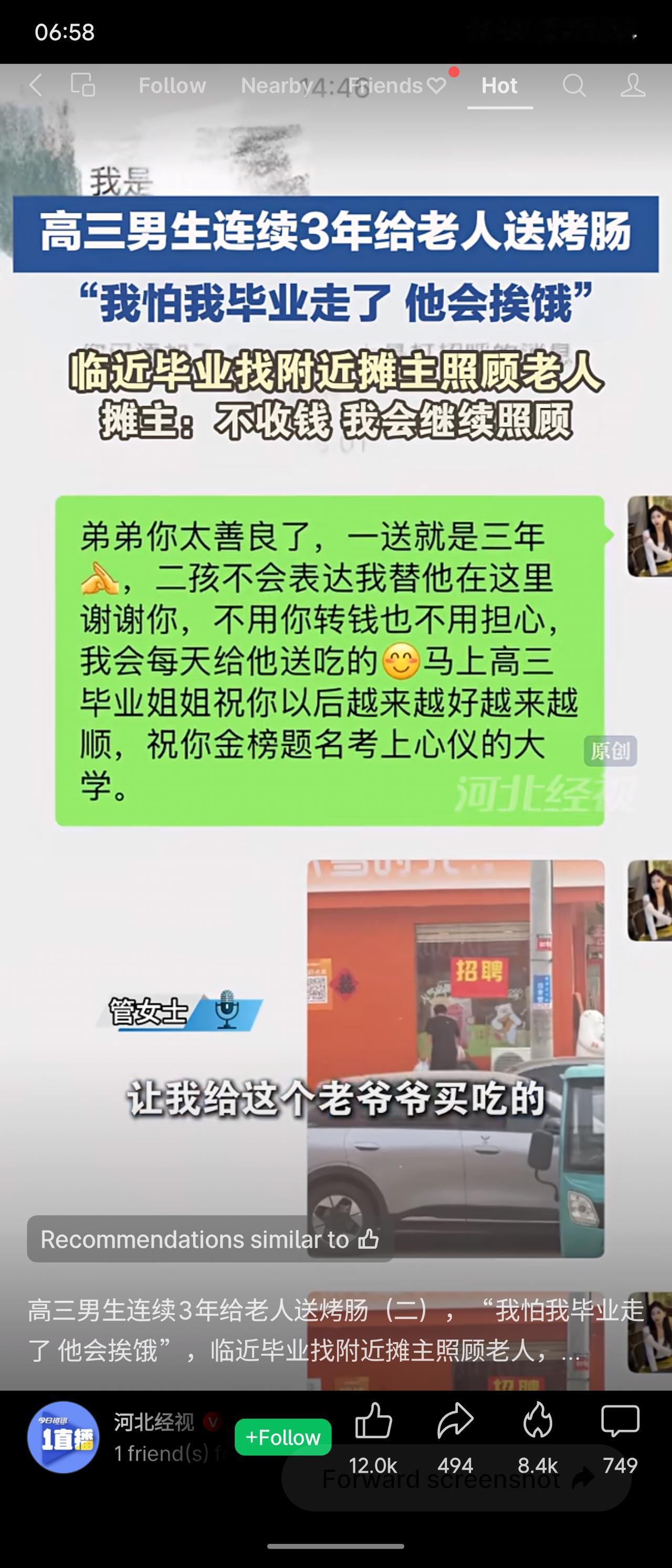 一名高三男生连续三年给一位老人送烤肠,临近毕业担心老人挨饿,便请求摊主继续代送并愿意每天转钱。摊主被他的善良打动,承诺免费照顾老人,让他安心备考。评价:三年如一日的坚持,展现了超越年龄的担当与纯粹善意。摊主的爱心接力,让温暖延续。这份善良无关成绩,却是最动人的人生答卷。