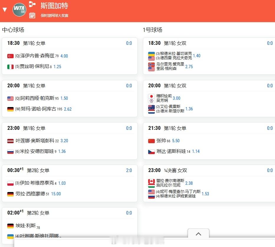 WTA500斯图加特站第一轮18:30 保利尼🇮🇹vs森梅兹🇹🇷21:30 张帅🇨🇳vs[14]诺斯科娃🇨🇿💥23:00 安德列娃🇷🇺vs奥斯塔彭科🇦🇲💥第二轮0:30 斯瓦泰克🇵🇱vs西格蒙德🇩🇪💥详细赛程见下图红土撒野季网球