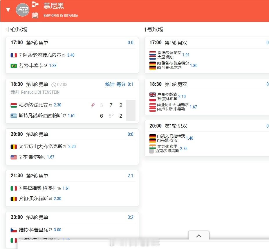 ATP500慕尼黑站第二轮17:00 林德克内希🇫🇷vs丰塞卡🇧🇷💥20:00 谢尔顿🇺🇸vs布洛克斯🇧🇪