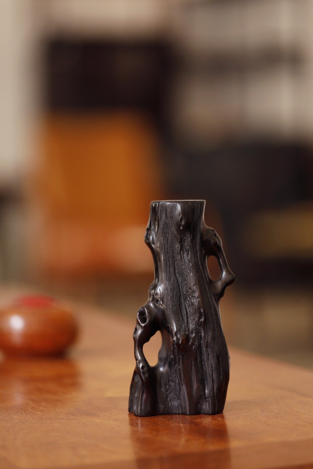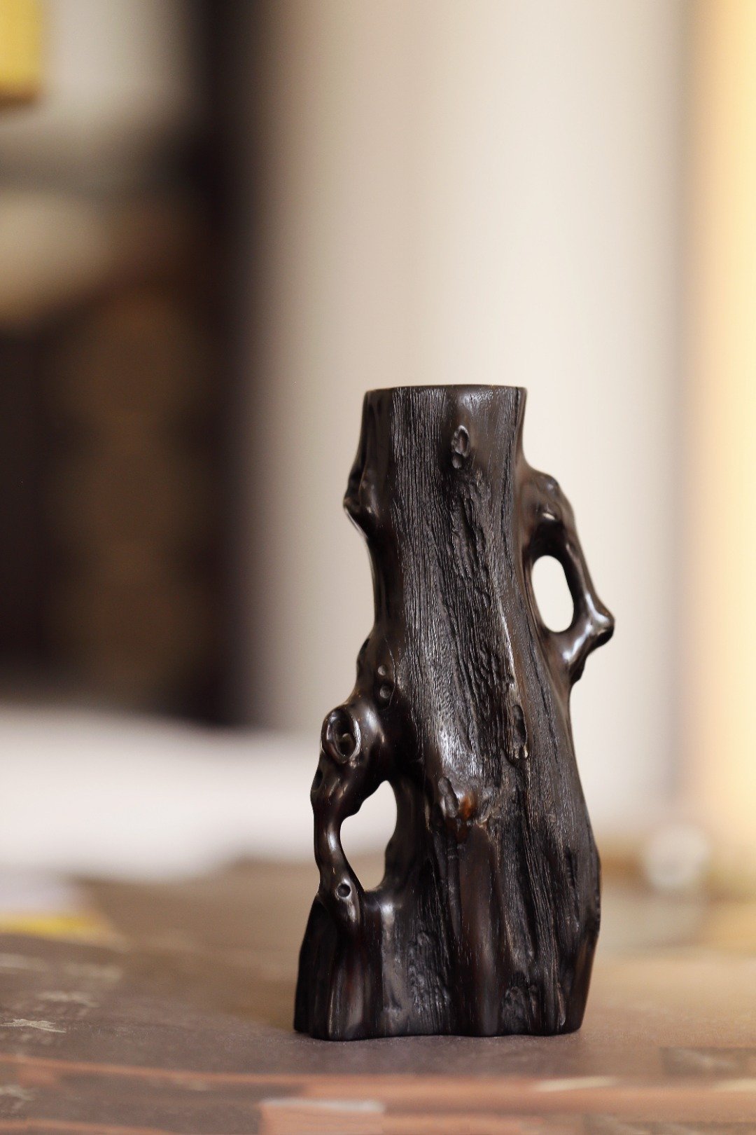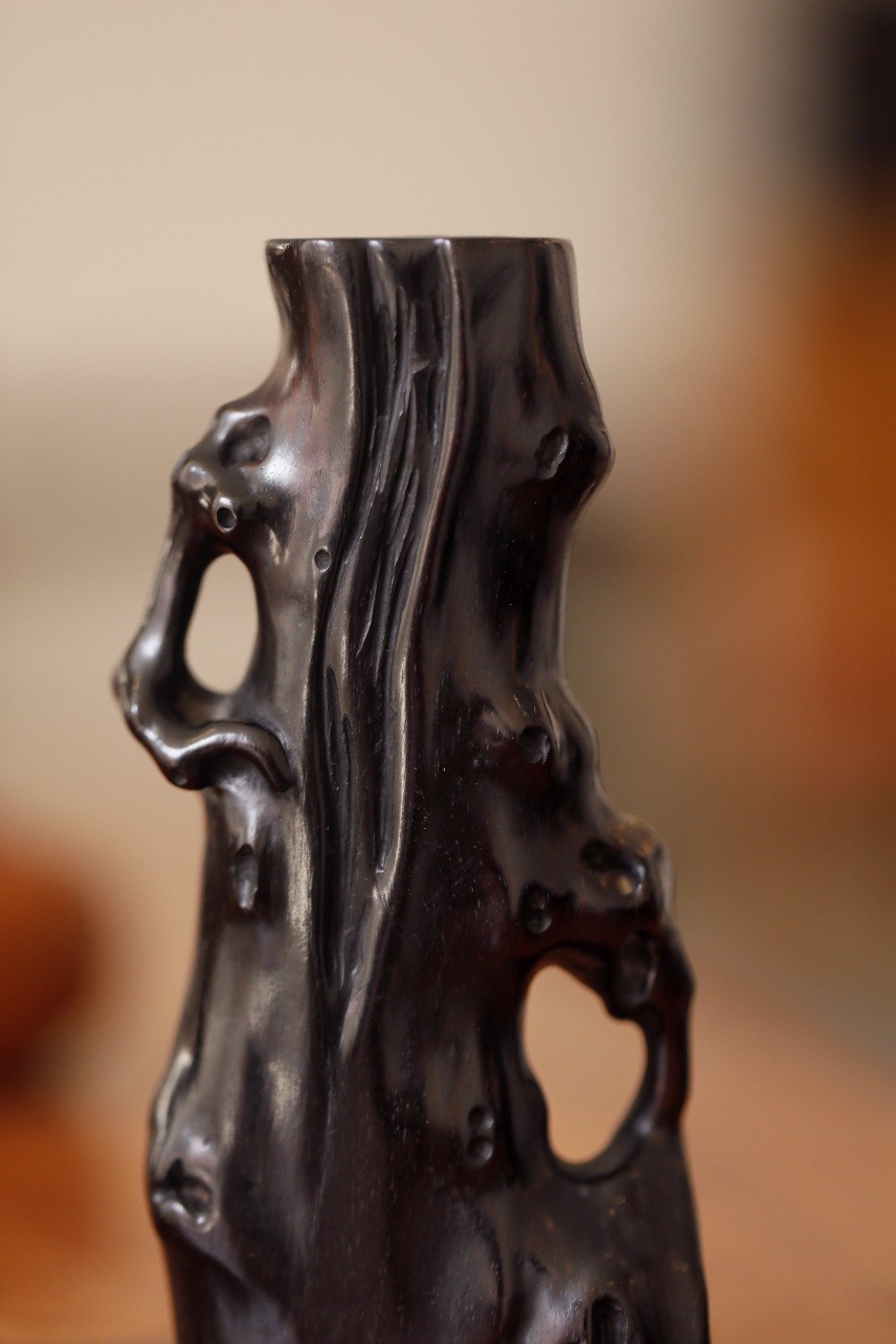 老紫檀 | 随形花插紫檀一木整挖,随形浮雕而成,构思巧妙,给人以厚重质感,刀法纯