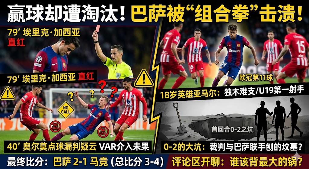 评论区也别光骂裁判了,我就问一句实在的:如果首回合不是0-2,哪怕是个1-2,巴萨至于死得这么憋屈吗?