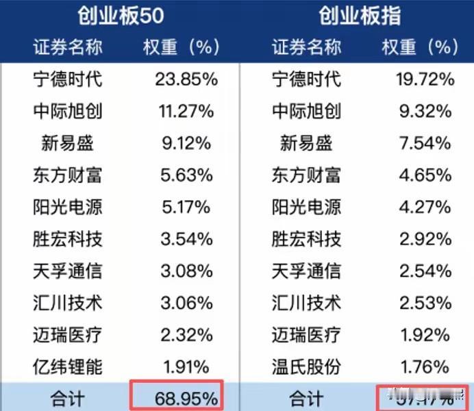 不知不觉中,创业板已经创出新高,究其原因,当前很多热门股票全部集中在创业板。比如创业板50,宁德时代、中际旭创、新易盛等十家公司所占比重高达68.95%,而创业板指数前十家公司占比也已经到了57.17%,这些公司都是涨幅非常不错的公司,尤其是“易中天”。