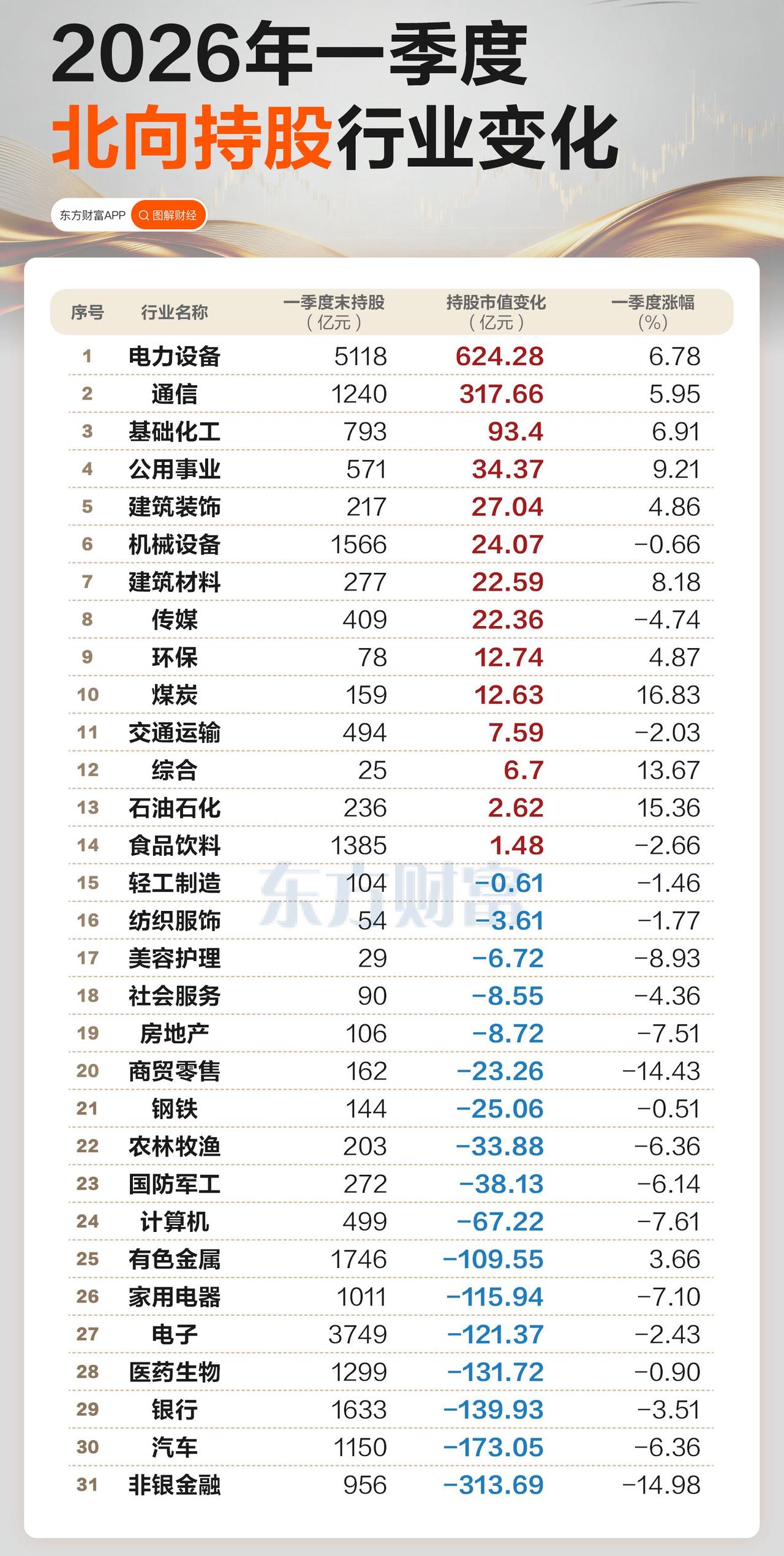 ✅ 坚定加仓:电力设备(+624.28亿)、通信(+317.66亿),两大科技成长赛道,是外资一季度绝对的主攻方向;