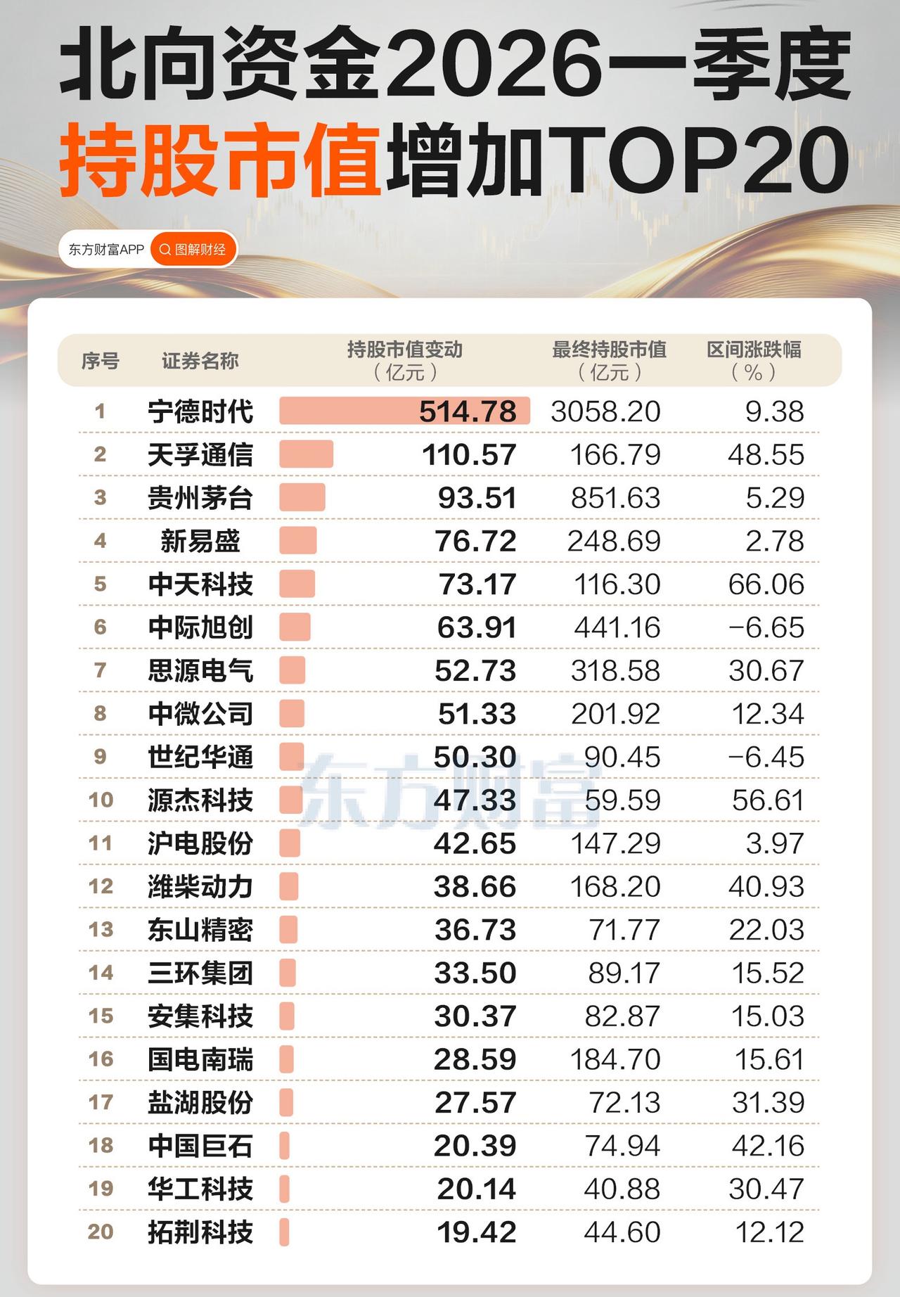 • 中天科技(+66.06%)、源杰科技(+56.61%)、天孚通信(+48.55%),一季度股价直接翻倍级上涨,外资同步大幅加仓,光模块、算力产业链成外资头号重仓方向;