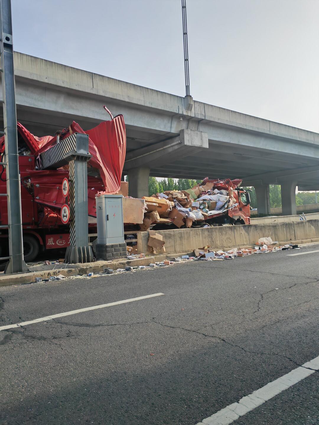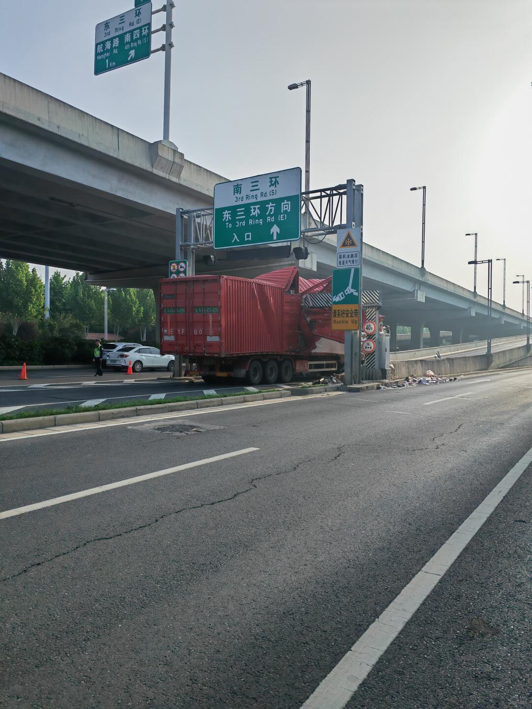 半挂车被削顶了,这限高杆这么硬…