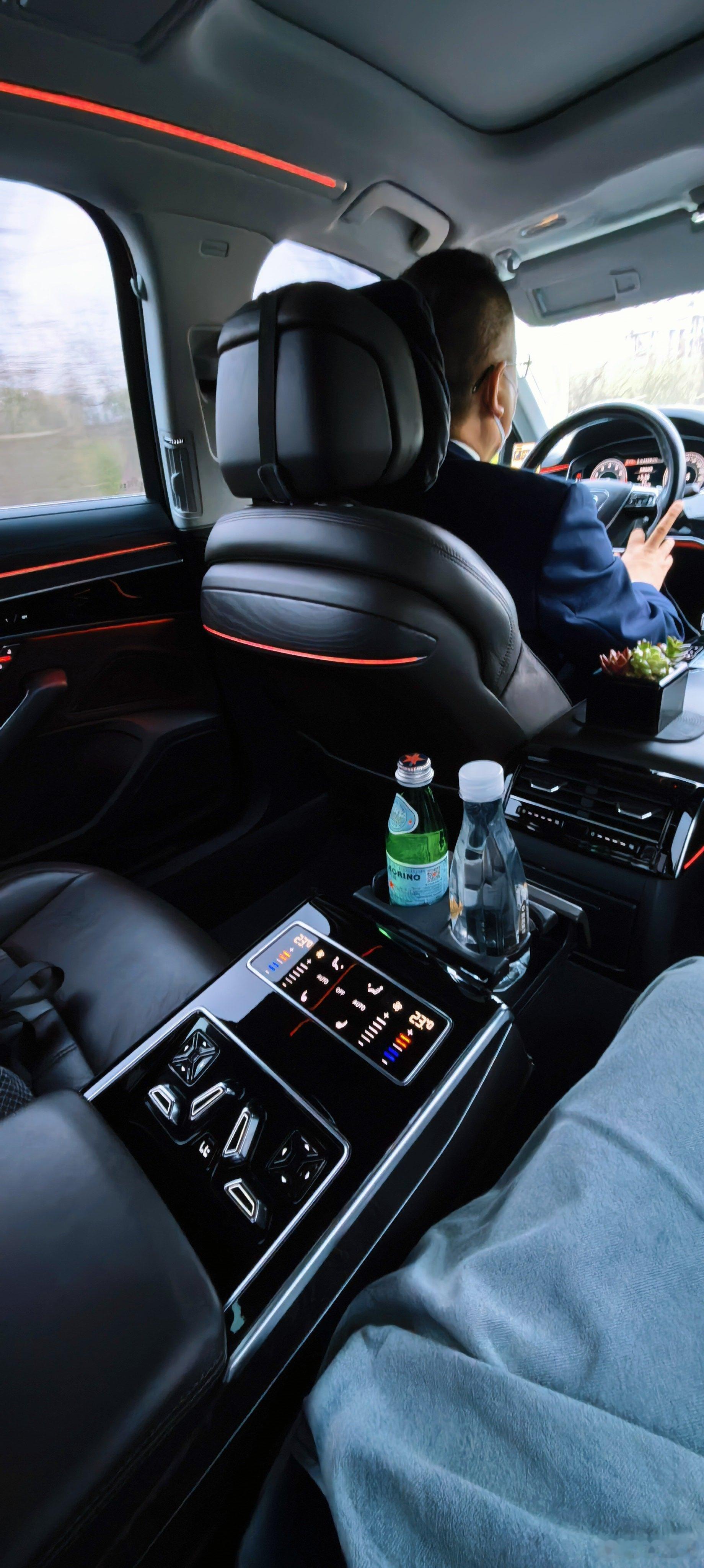 坐上了大A8,出发去机场。忘穿行政夹克了,这一路我坐得像个学生一样。A8L这空间确实可以,舒适度也不错,但是后排没无线充电,没娱乐屏,对我这学生不太友好,所以我还是更期待王师傅能尽早开上尊界送机