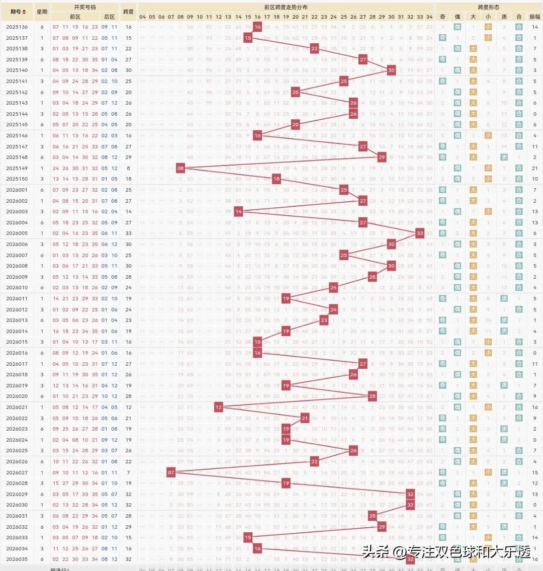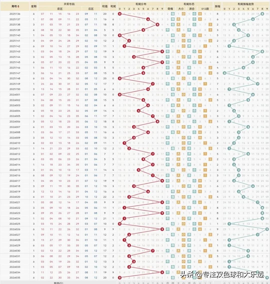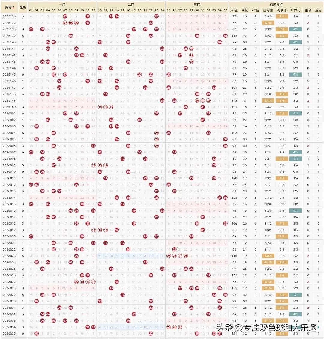 大乐透26036期: 上期26035期开的挺特别的,一二区只有各1个2尾的2和