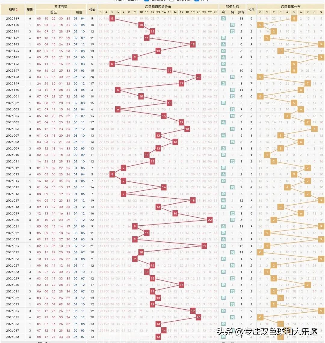 本期039期后区和值看好21,看后区和值走势图21很顺,可看具体选号,貌似6可能会重,这样的话,和值就达不到21了,有点为难了。