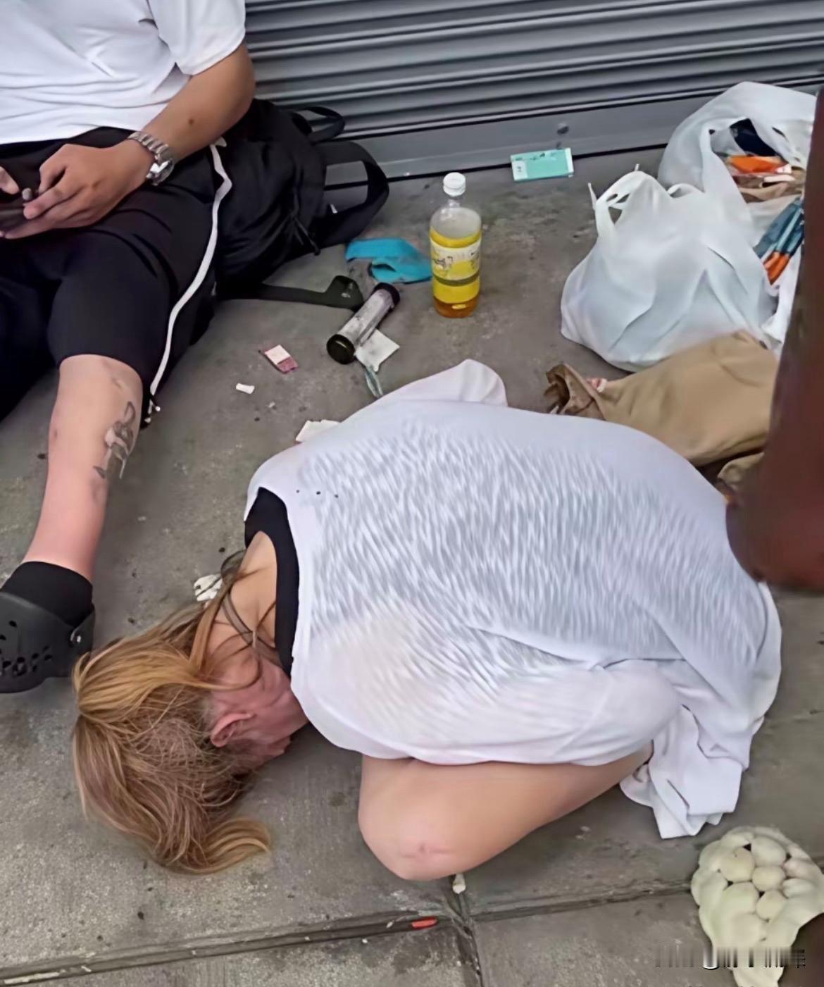 你能相信吗!在美丽的街头,像这样的场景随处可见。这个女孩年纪轻轻,却似乎已经失去了未来。她过早地接触了一些不该接触的东西,导致了严重的依赖,甚至对她的身体造成了伤害,连站立的力气都没有。这样的画面让人心痛,她们无家可归,流浪在街头,没有人关心,没人问津,任凭她们自生自灭!