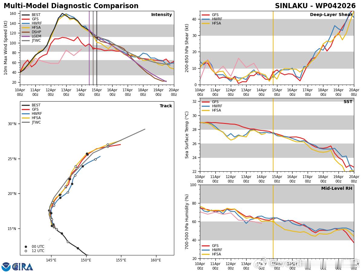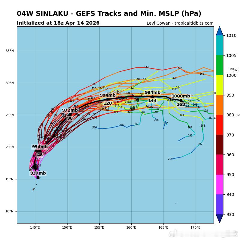 【森拉克】从卫星云图、中央气象台和日本气象厅给出的台风路径看,昨晚超强台风森拉克的中心从塞班岛南部一带经过。今晨森拉克已经减弱为强台风。未来海温下降、垂直风切变加大,强度会继续减弱。今天北上为主,明天越过副高脊线后,向东分量加大,17日以后在西风带里,加速向东北行。