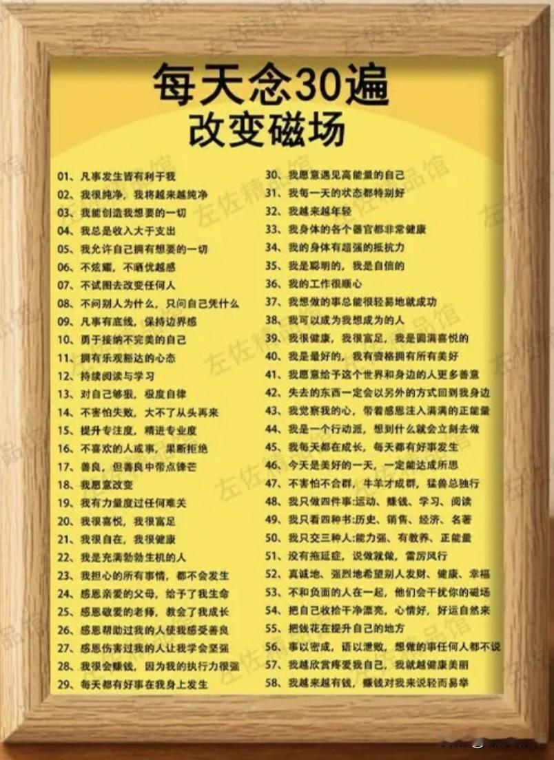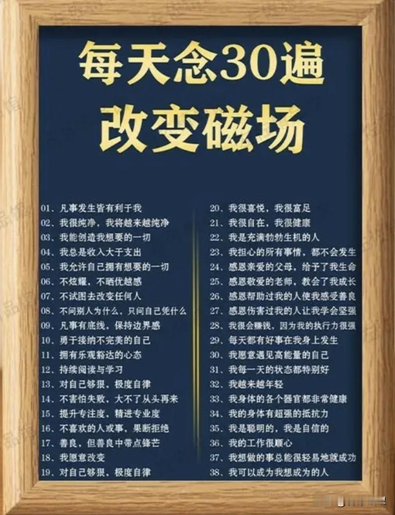 我相信,每天默念30遍,定会改变自己的磁场,会让自己越来越情绪稳定,会让自己越来越睿智,会让自己内心越来越强大,更会让自己越来越有钱,友友们,都念起来,在潜移默化中,成为那个强大智慧富有的自己! 金粉社区 智慧