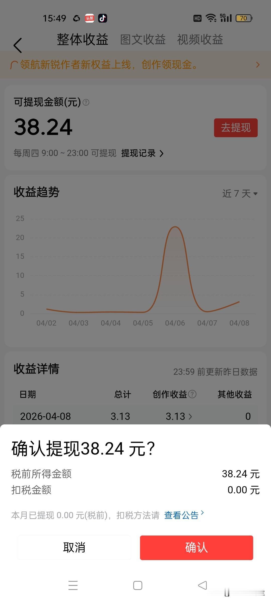 今天是周四,又到了头条提现的日子,上周只有9块钱,我没有提现,这周收到了一个活动奖金,有20块钱,终于可以提现了。