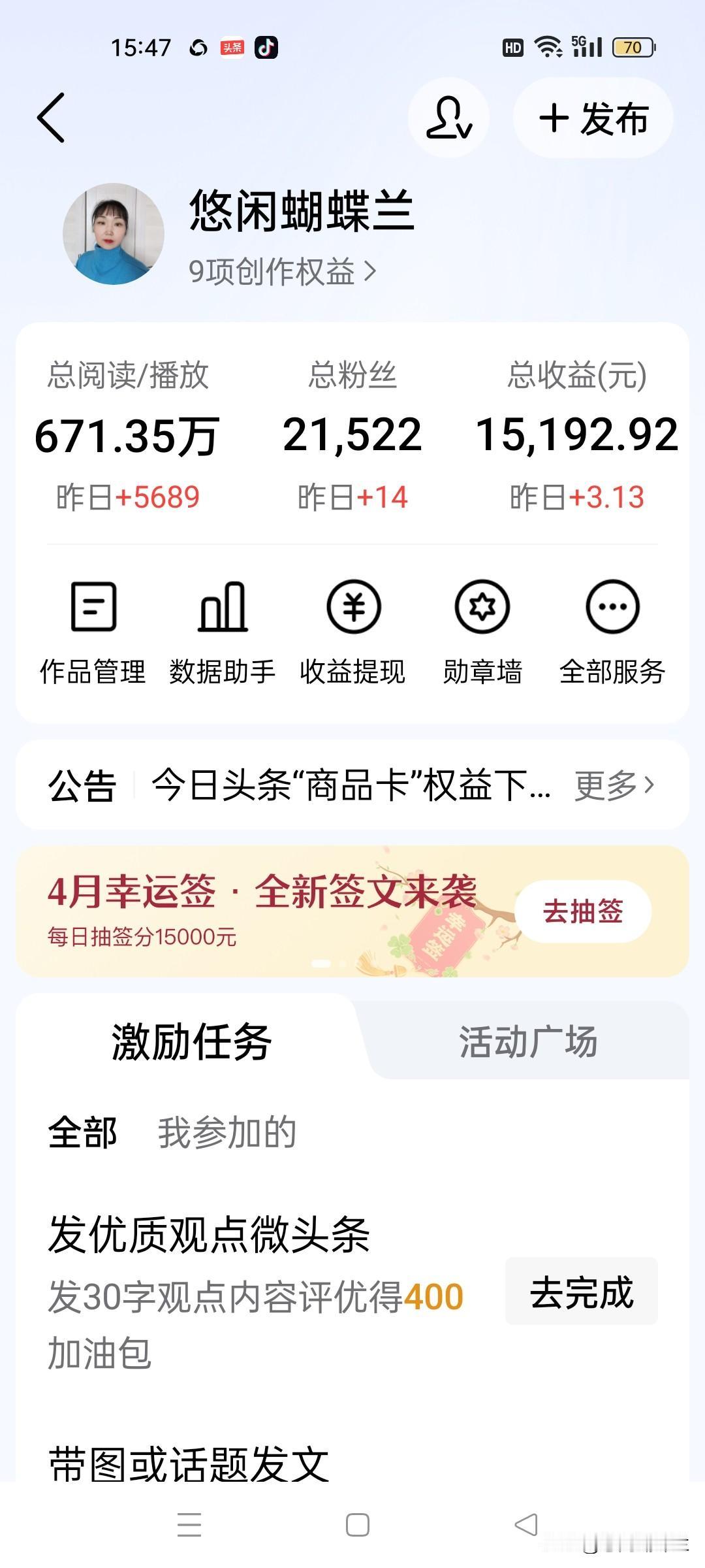 工号那边我每天至少更新一篇文章,再发两篇贴图,收益比头条好,就是每天也要互动,时间就紧张了。