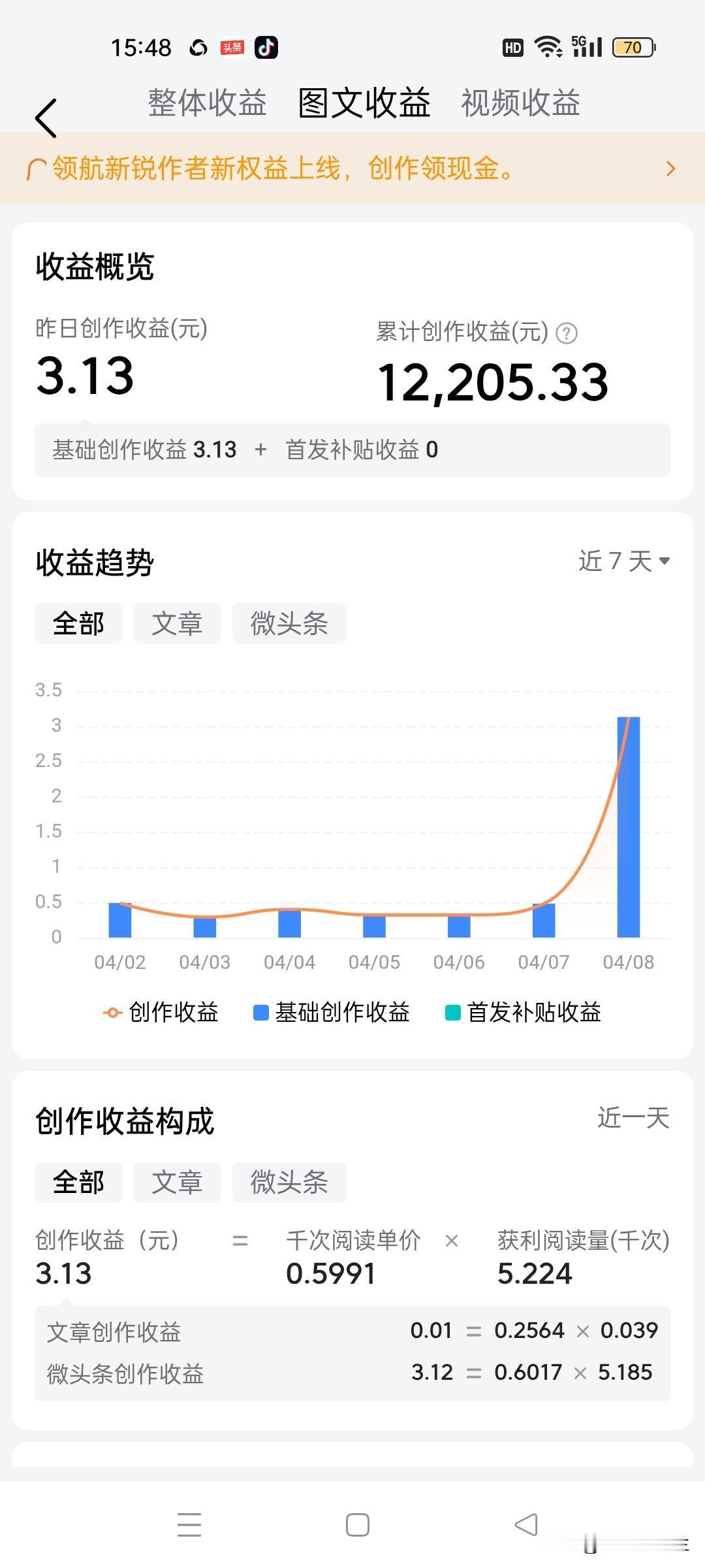 最近我的收益每天只有几毛钱,如果靠阅读量的收益,一周能赚1块钱就不错了,现在我就是靠参加活动,每天打卡活动,总能分到一点奖金的。
