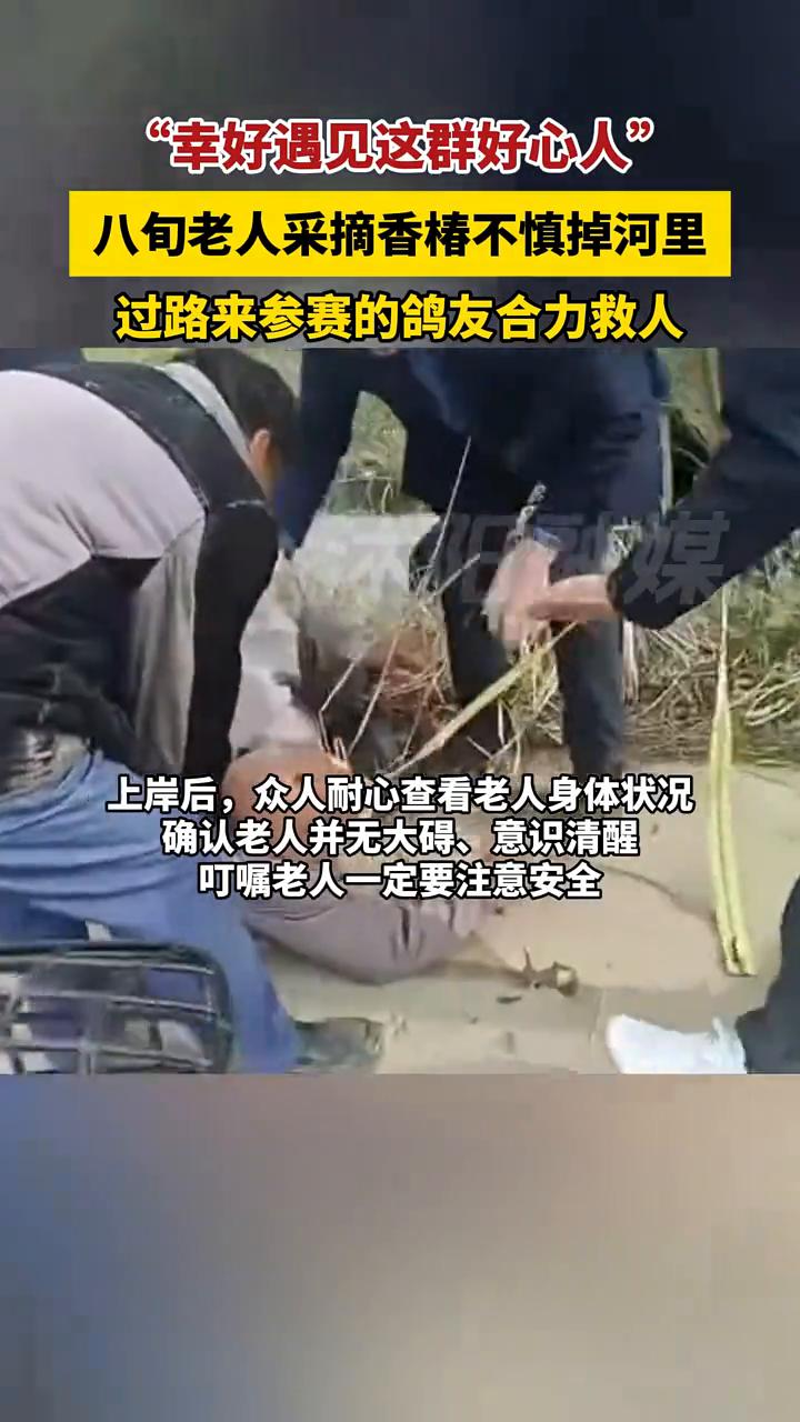 "幸好遇见这群好心人",八旬老人采摘香椿不慎掉河里,过路来参赛的鸽友合力救人。