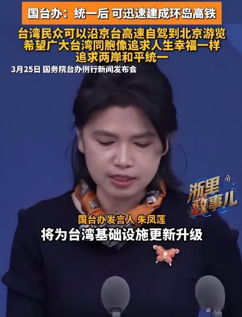 3 月 25 日国台办发布会明确:和平统一后,大陆将全力支持台湾基础设施升级,环岛高铁、东西向高速、海峡快速通道通通安排上,最让人热血沸腾的是 ——未来可沿京台高速,从台湾自驾直达北京!
