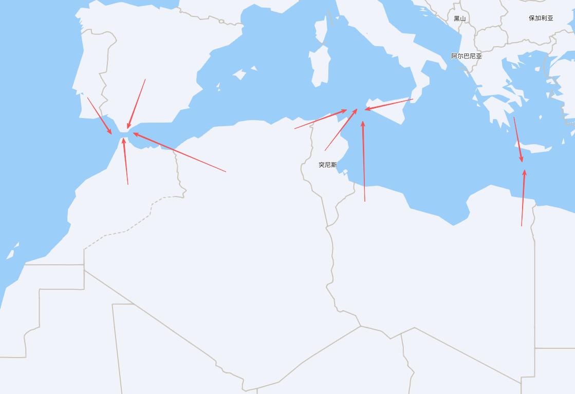 突尼斯海峡,突尼斯可以,阿尔及利亚也可以,利比亚西方派也可以,意大利也可以,马耳他也可以。