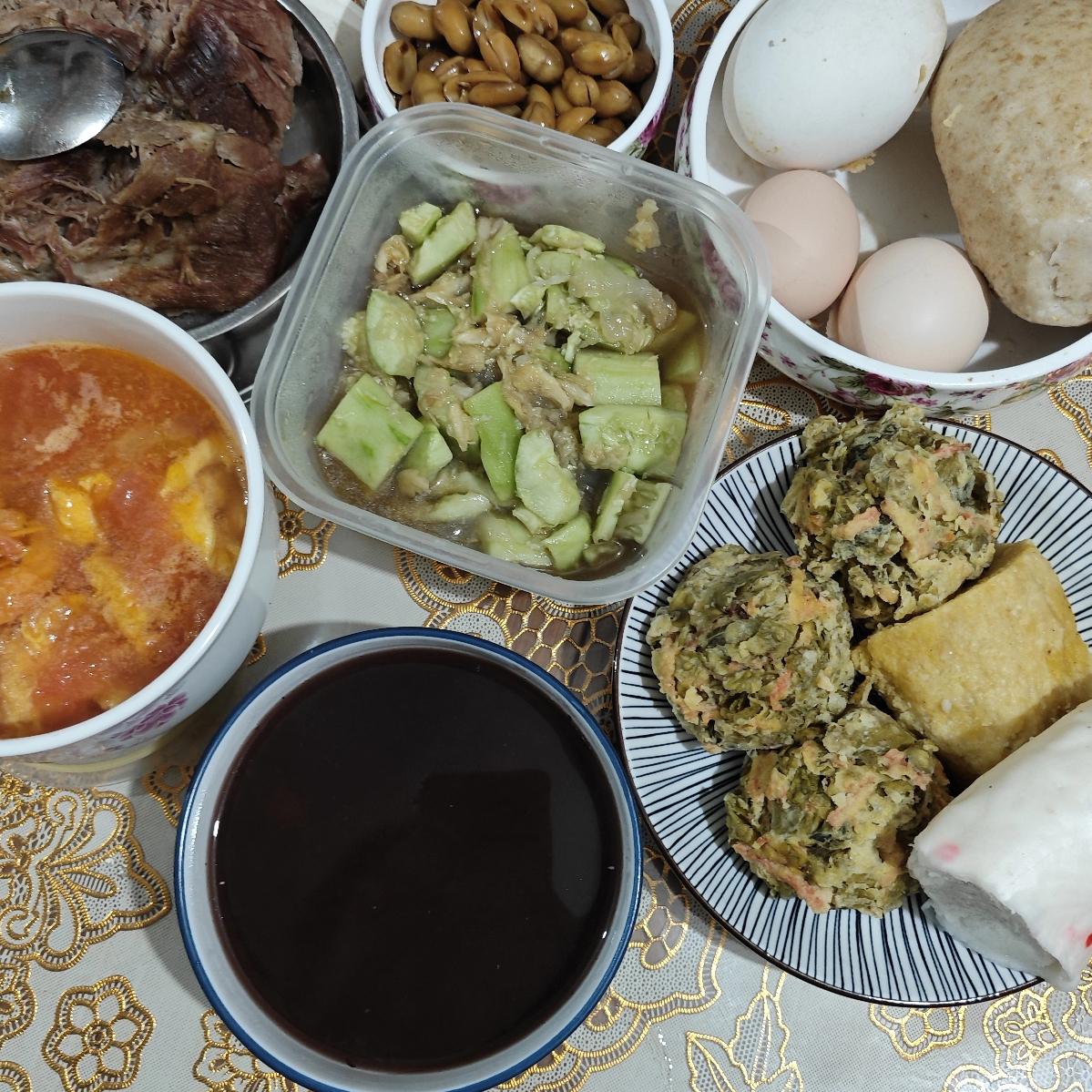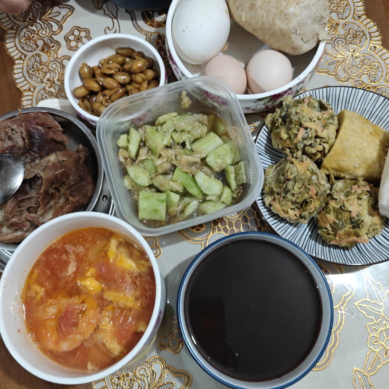 其它的,一母鸡蛋,一鹅蛋,一饼子,一馒头,一花生米咸菜,一凉拌黄瓜,一大虾西红柿。