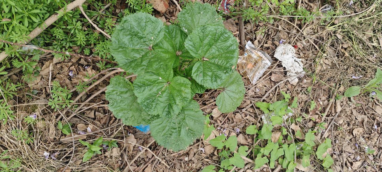 圆形大叶片、叶面褶皱、边缘带锯齿,掐断有黏滑汁液。