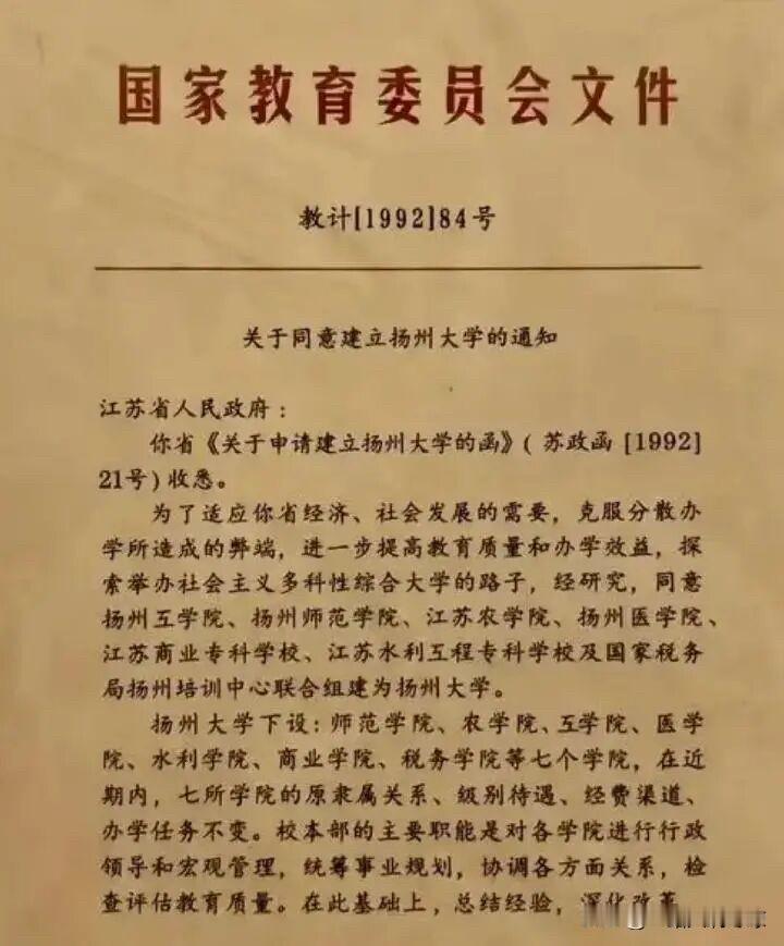 1992年5月,扬州医学院与扬州师范学院、江苏农学院、扬州工学院、扬州水利工程专科学校、江苏商业专业学校,联合组建扬州大学。合并后,扬州医学院从此降格为扬州大学的一个二级学院——“扬州大学医学院”。那个独立品牌的“扬州医学院”,就此消失在历史的长河中。