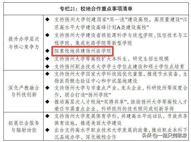扬州市人民政府印发《扬州市国民经济和社会发展第十五个五年规划纲要》。其中,“探索校地共建扬州医学院”被写入“校地合作重点事项清单”专栏。
