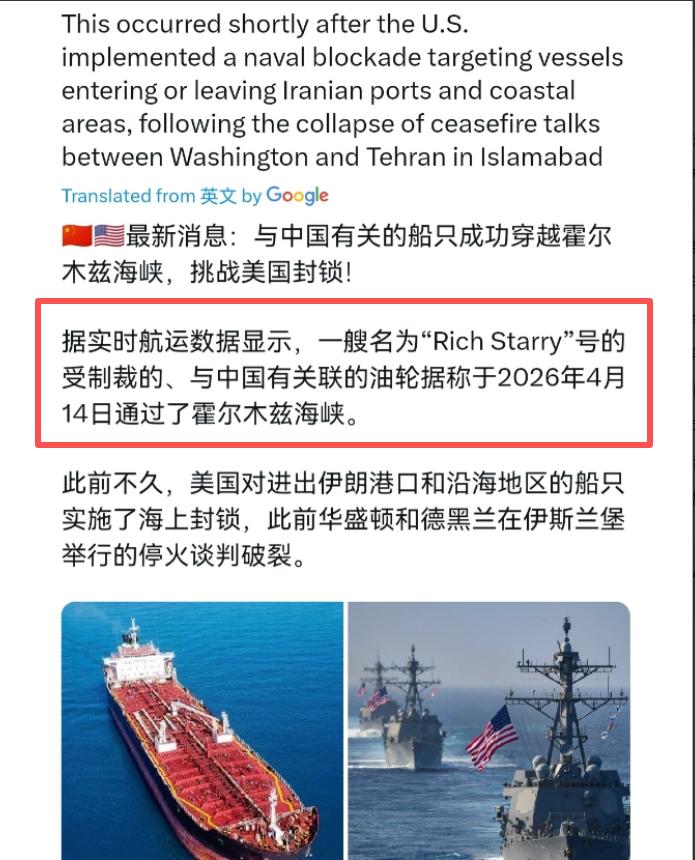 美国估计有点下不来台了!特朗普刚宣布封锁令,中国实控油轮“璀璨富豪号“通过霍尔木兹海峡!4月14日,根据外媒报道,外媒称,根据实时航运数据显示,一艘受制裁、与中国有关的油轮“璀璨富豪号”已穿越霍尔木兹海峡。
