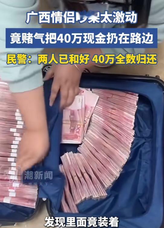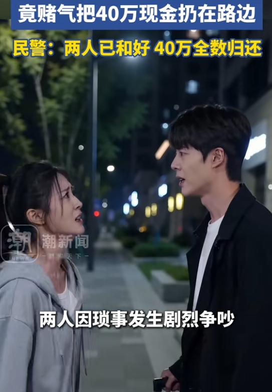 (信息来源:《情侣吵架太激动,竟把40万现金遗弃在路边!经民警调解,两人重归于好,40万现金也归还原主。》潮新闻)