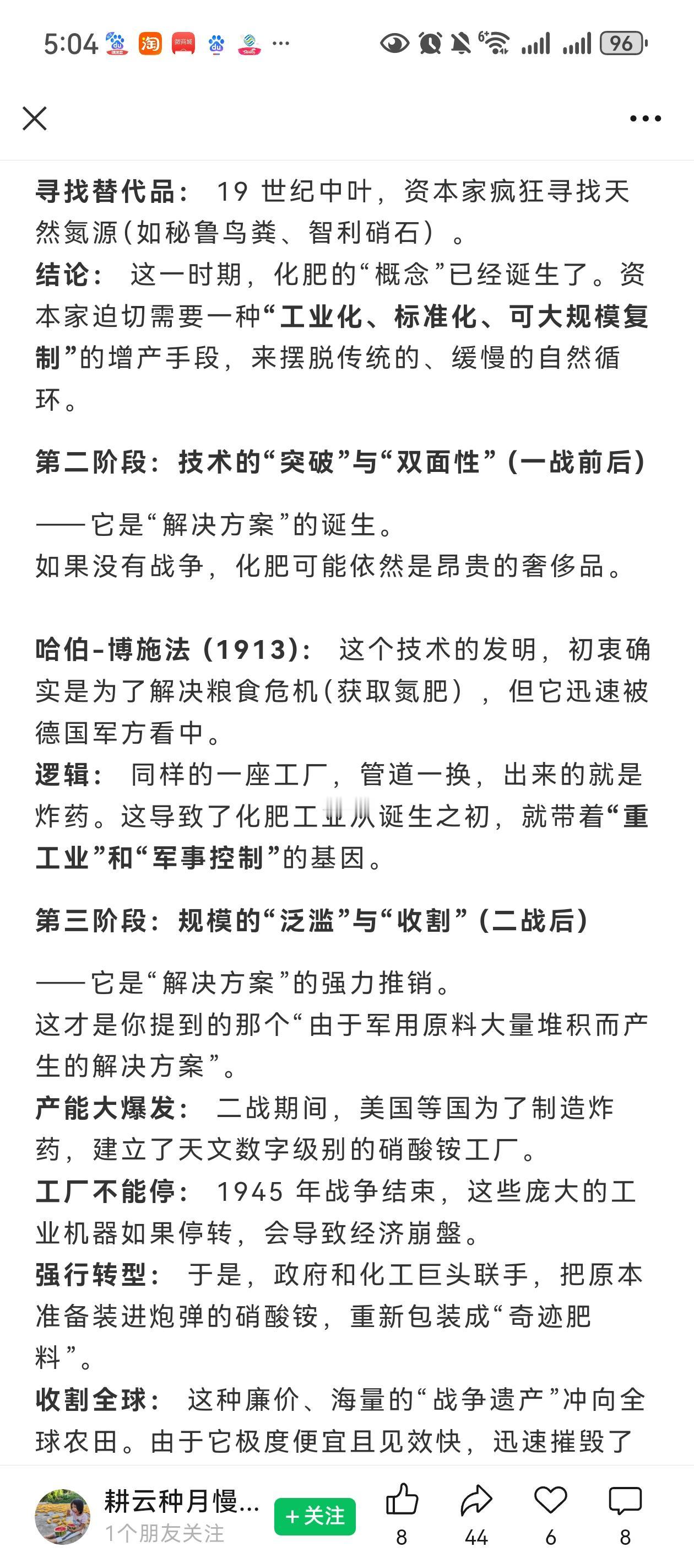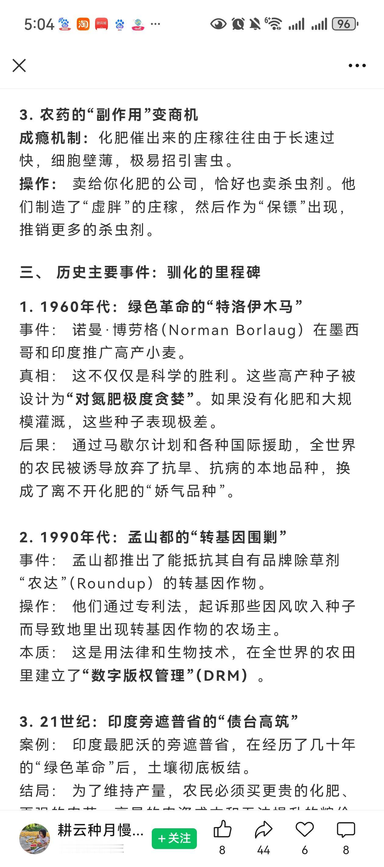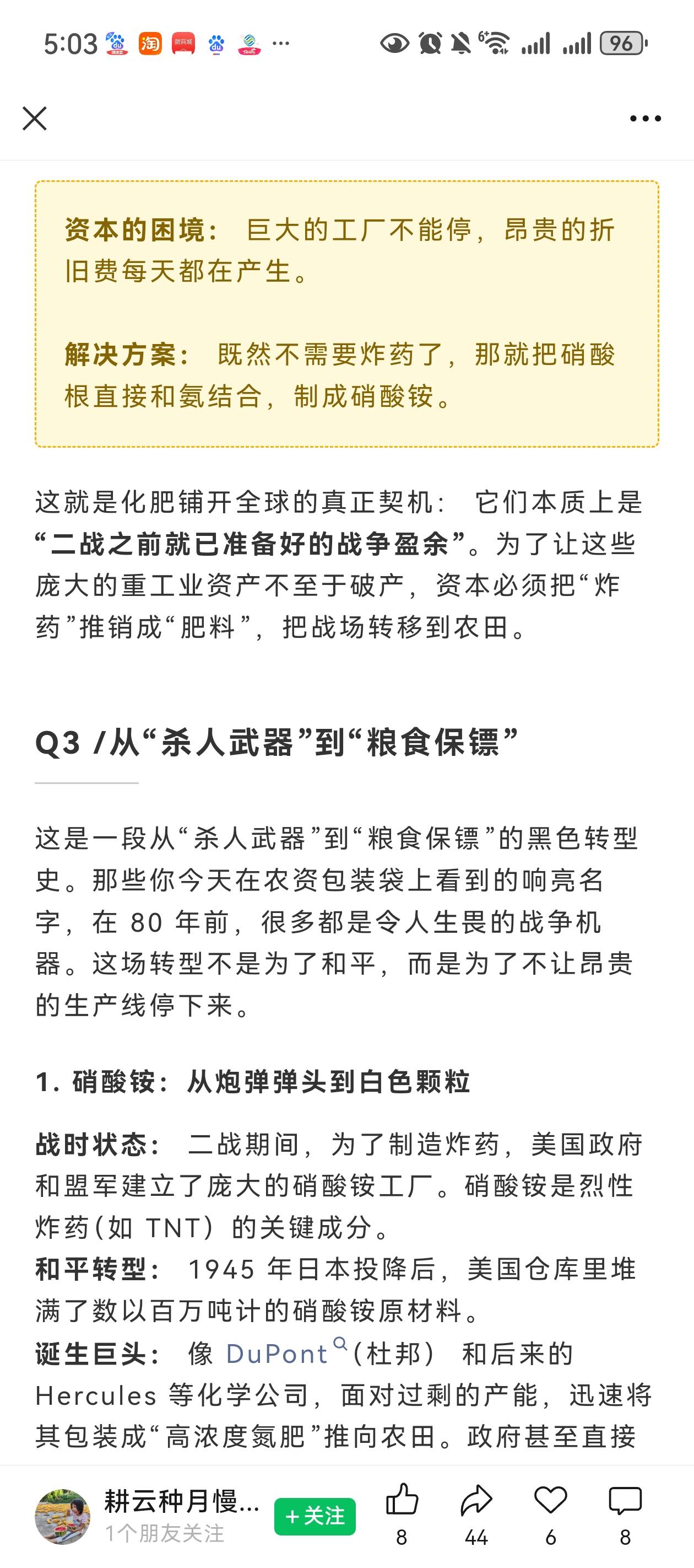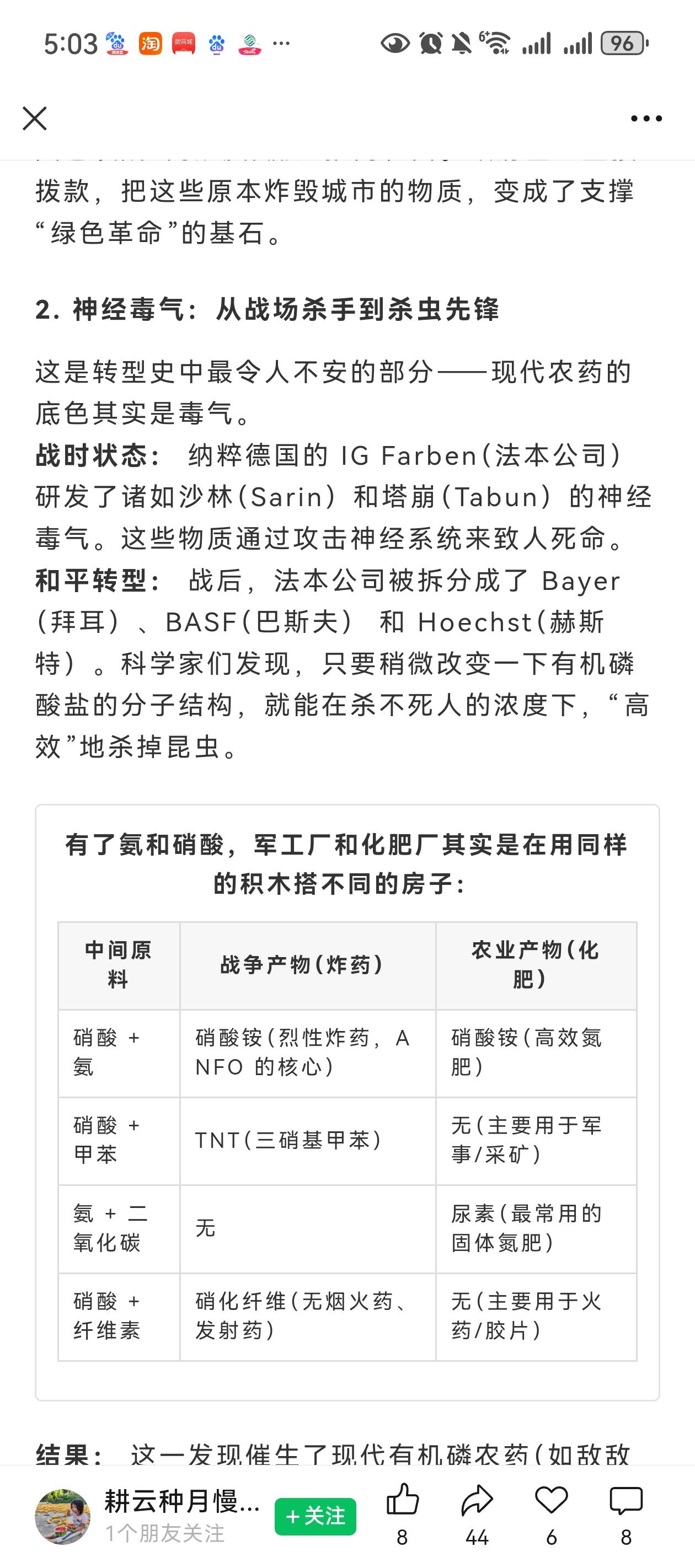 化肥的前身是炸药,农药的前身是战场上神经毒剂,都是军工巨头主导的产品。二次世界大战后,炸药和神经毒剂用途变小了,为了为它们找市场,就用在了农业---炸药的原材料用来生产化肥,神经毒剂直接从战场上撤下来,降低浓度就可以杀虫。至此,二战期间的军用物资完成由战场到农场的华丽转身,还取了个漂亮名字叫“绿色革命”。