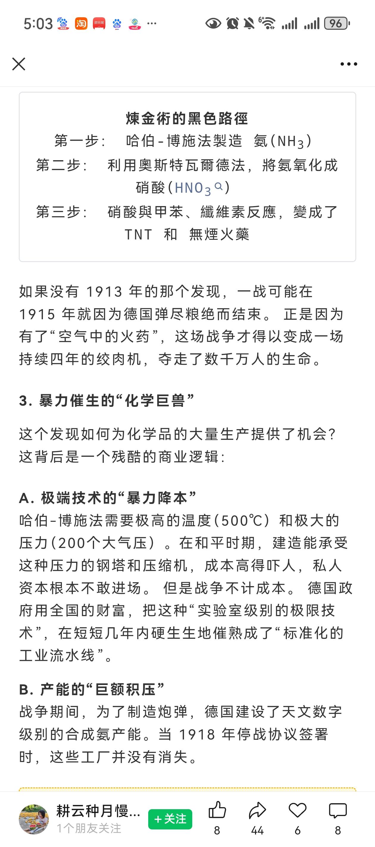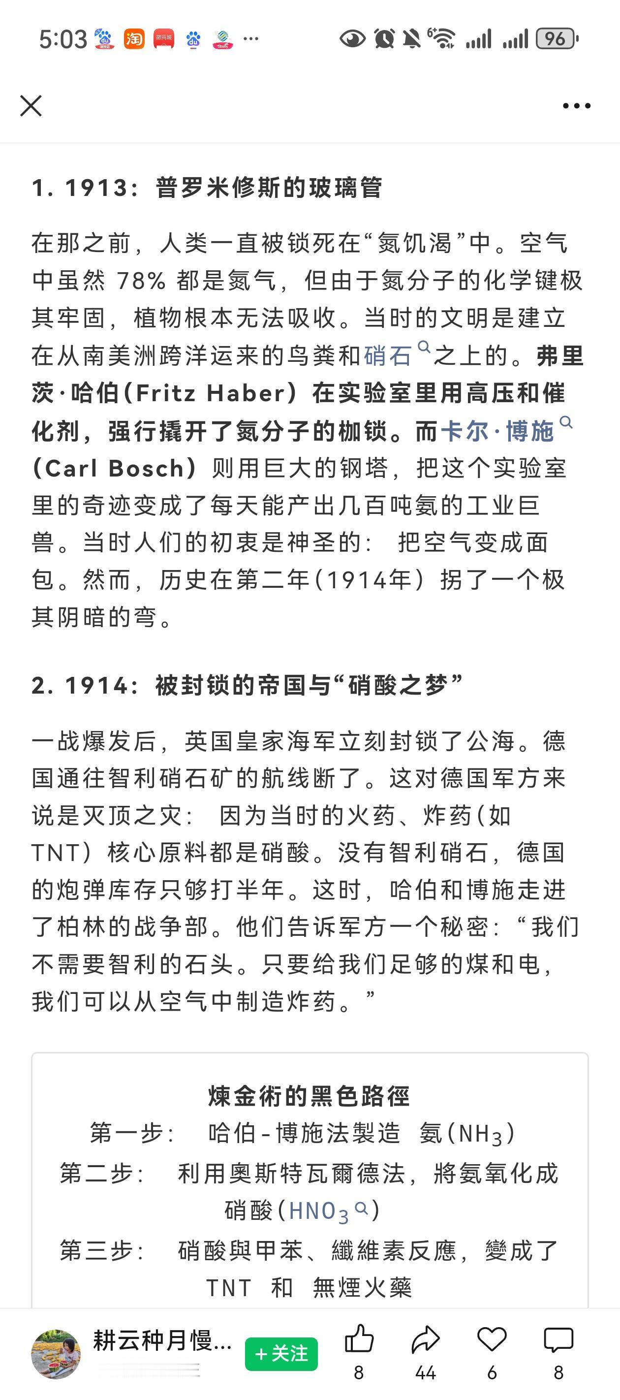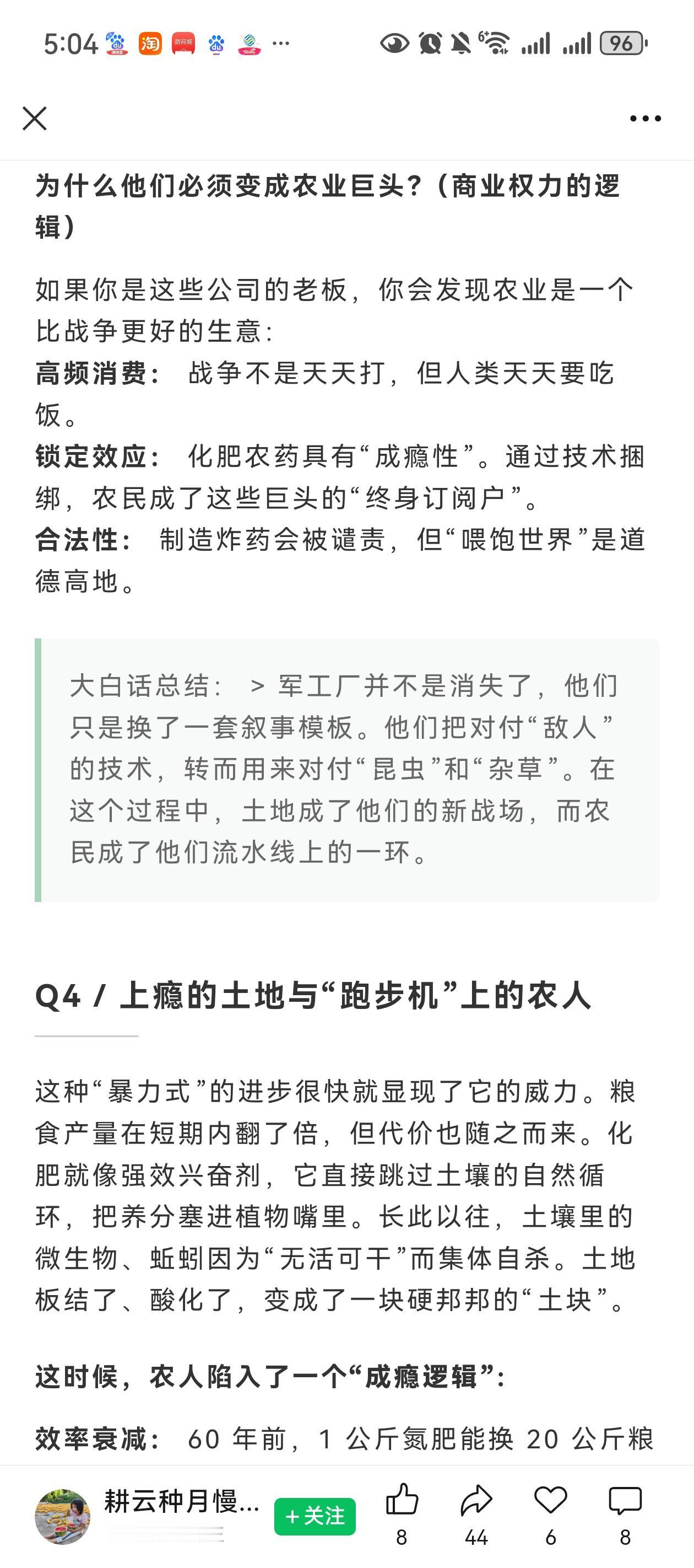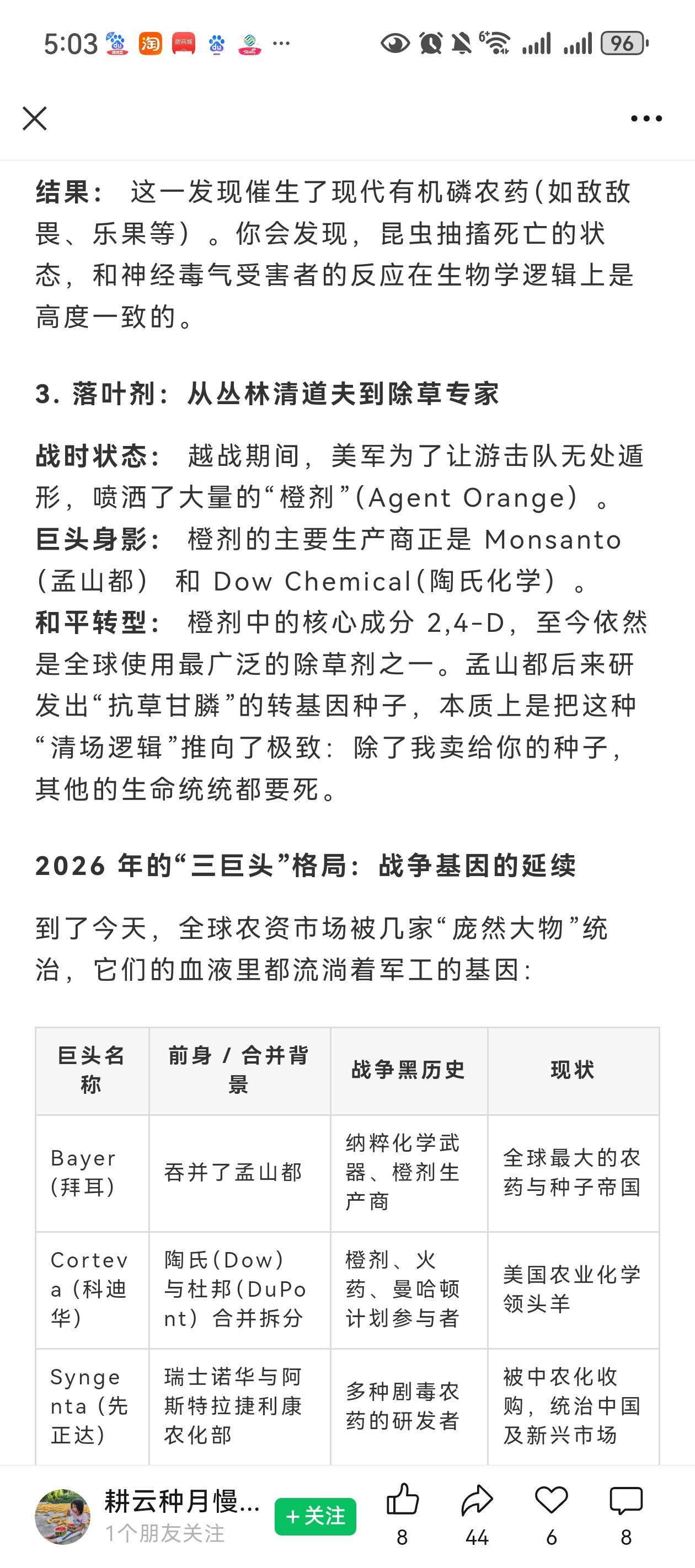 化肥的前身是炸药,农药的前身是战场上神经毒剂,都是军工巨头主导的产品。二次世界大战后,炸药和神经毒剂用途变小了,为了为它们找市场,就用在了农业---炸药的原材料用来生产化肥,神经毒剂直接从战场上撤下来,降低浓度就可以杀虫。至此,二战期间的军用物资完成由战场到农场的华丽转身,还取了个漂亮名字叫“绿色革命”。