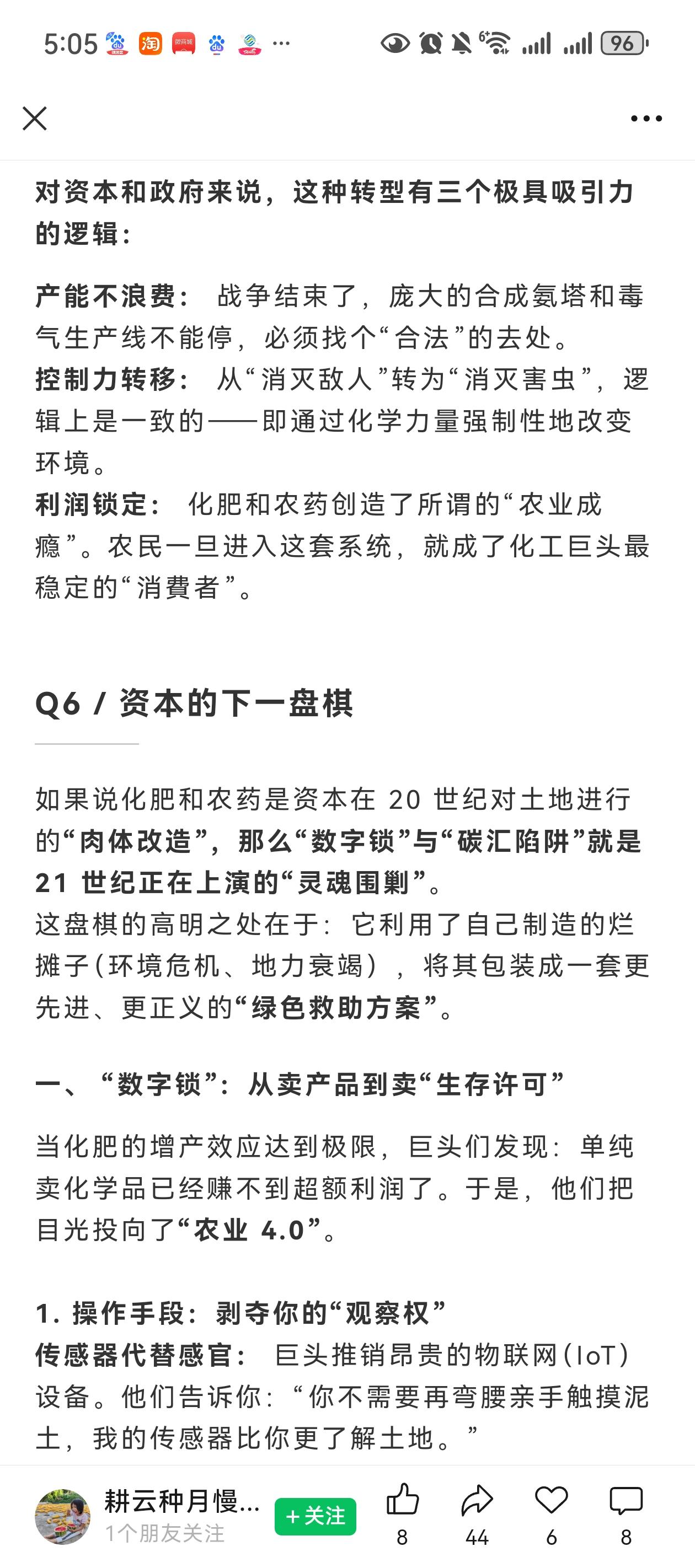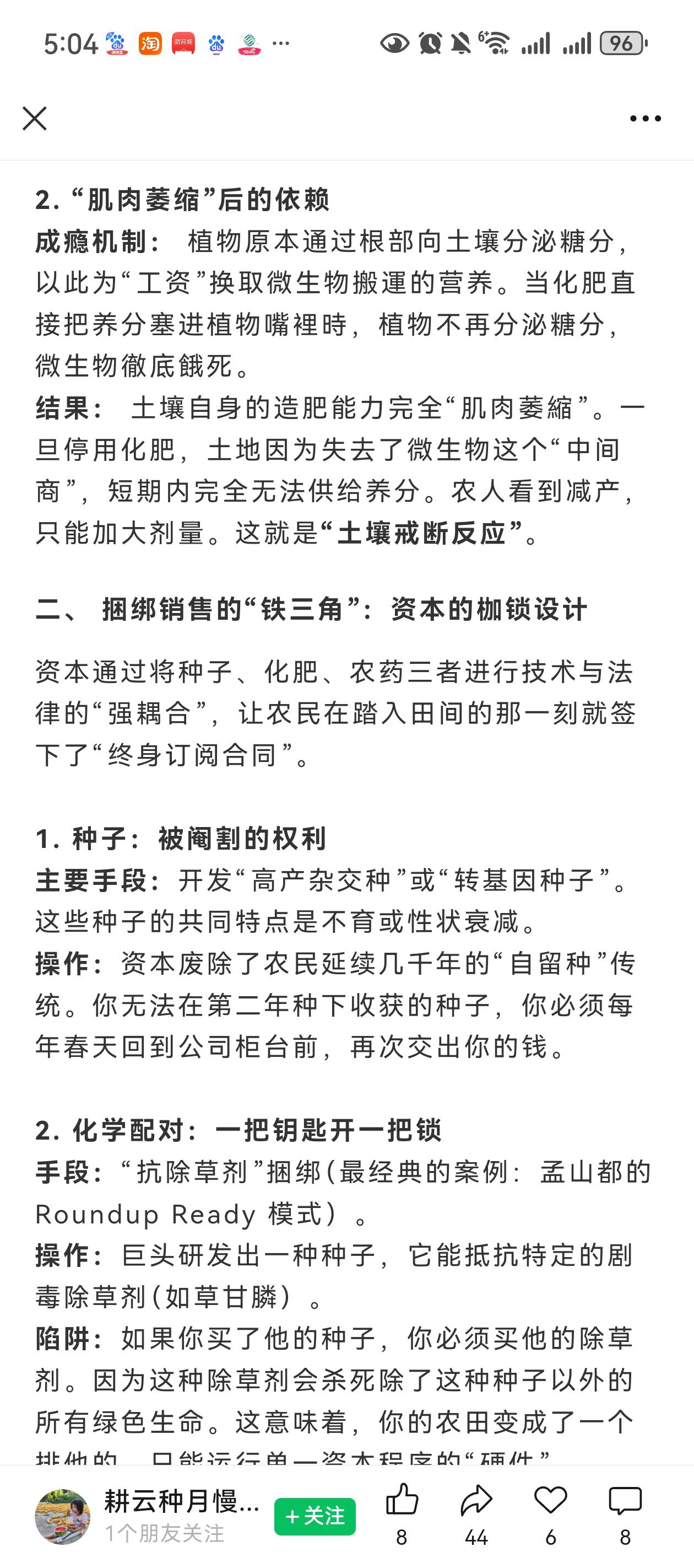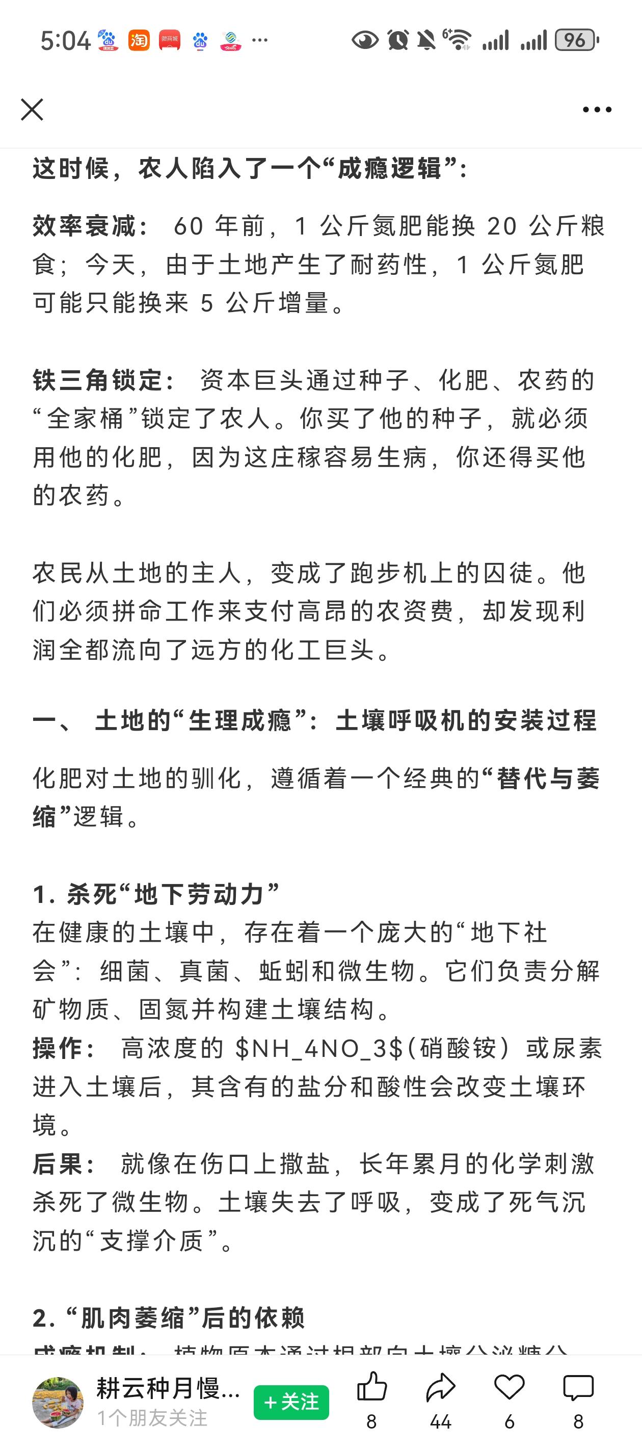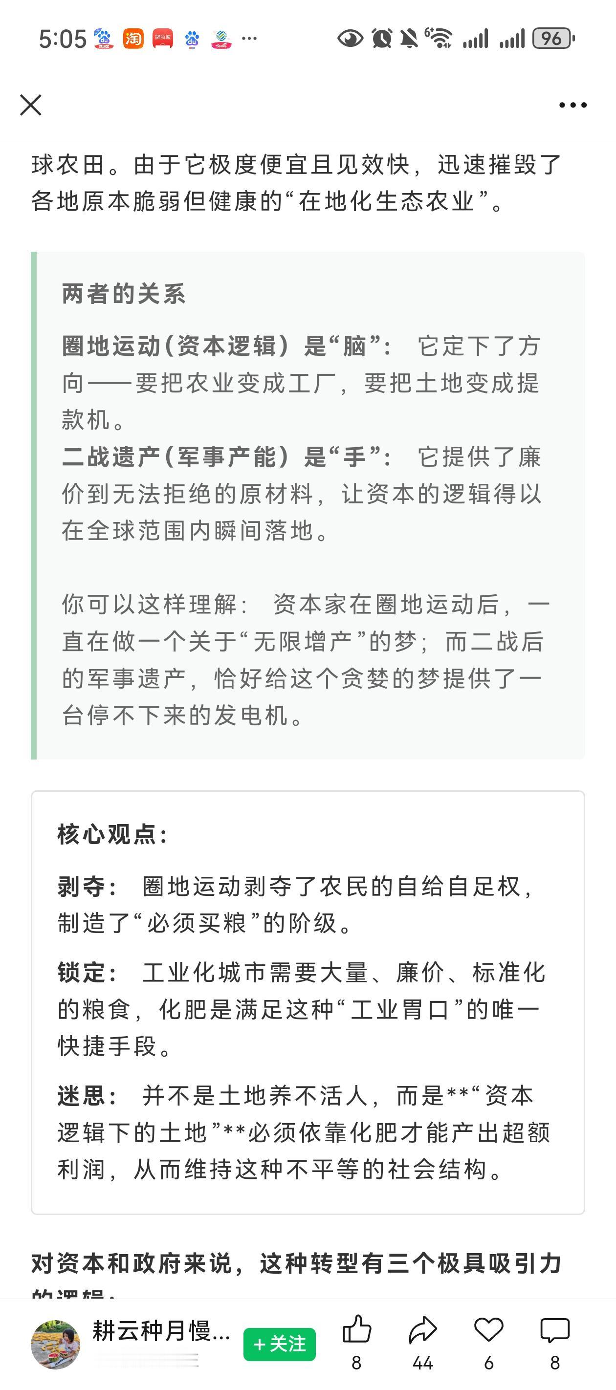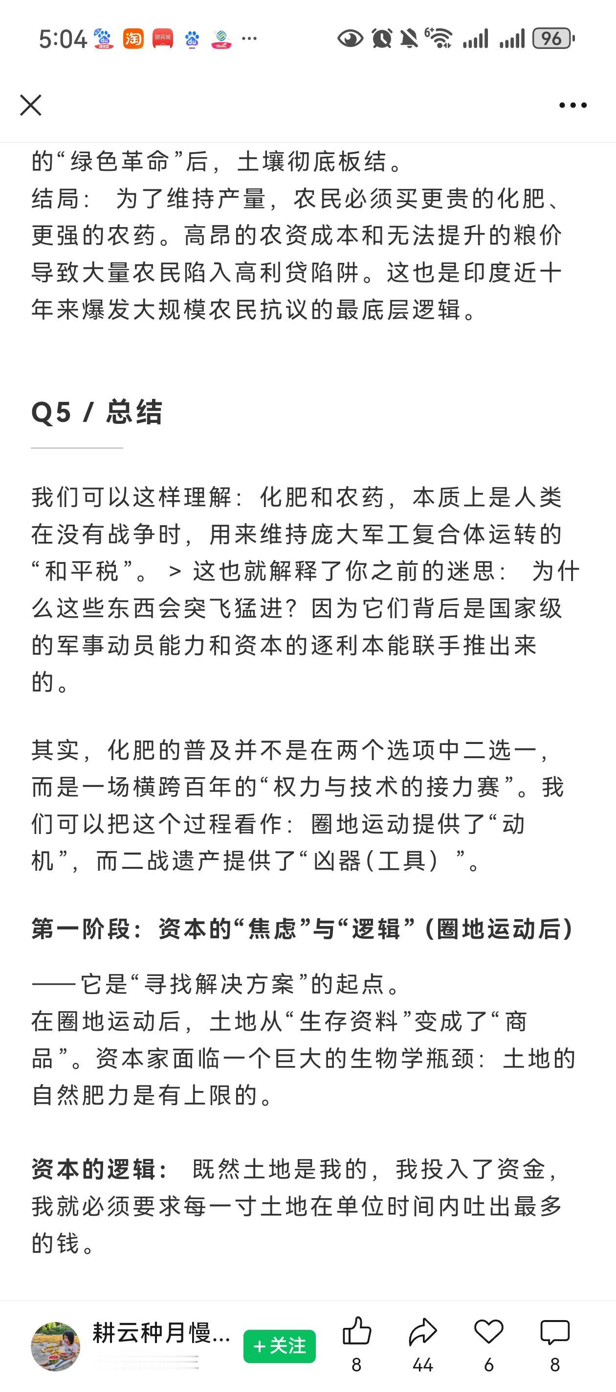 化肥的前身是炸药,农药的前身是战场上神经毒剂,都是军工巨头主导的产品。二次世界大战后,炸药和神经毒剂用途变小了,为了为它们找市场,就用在了农业---炸药的原材料用来生产化肥,神经毒剂直接从战场上撤下来,降低浓度就可以杀虫。至此,二战期间的军用物资完成由战场到农场的华丽转身,还取了个漂亮名字叫“绿色革命”。