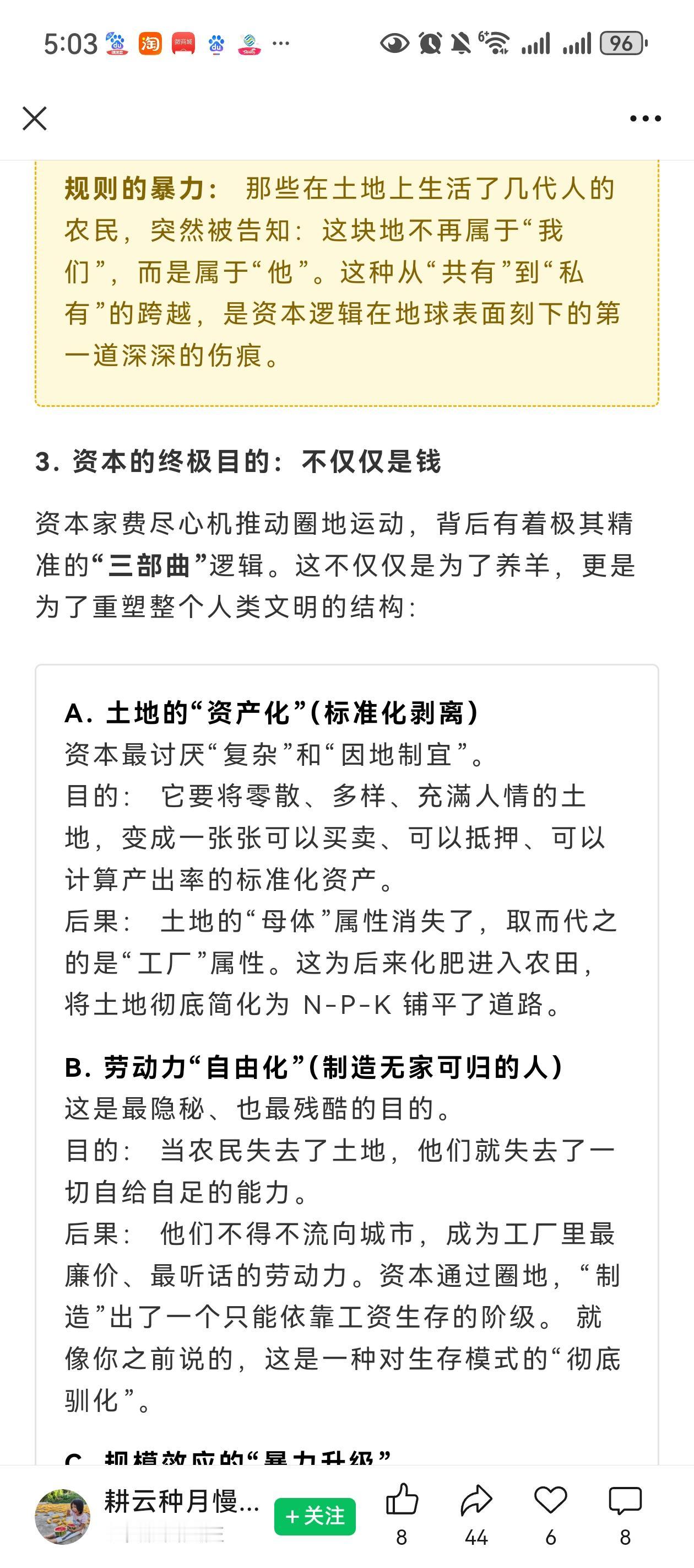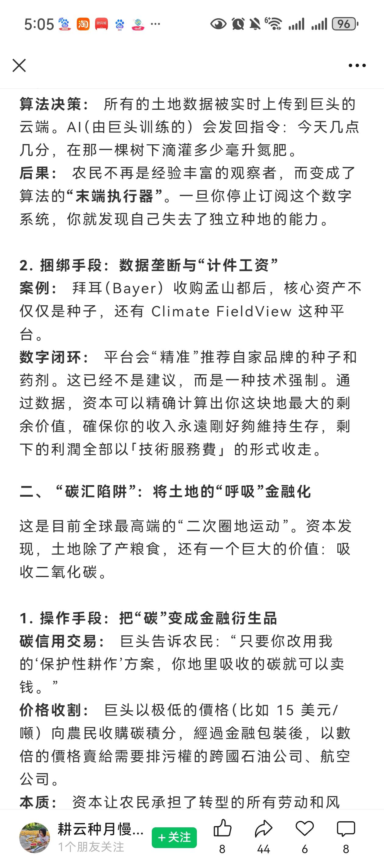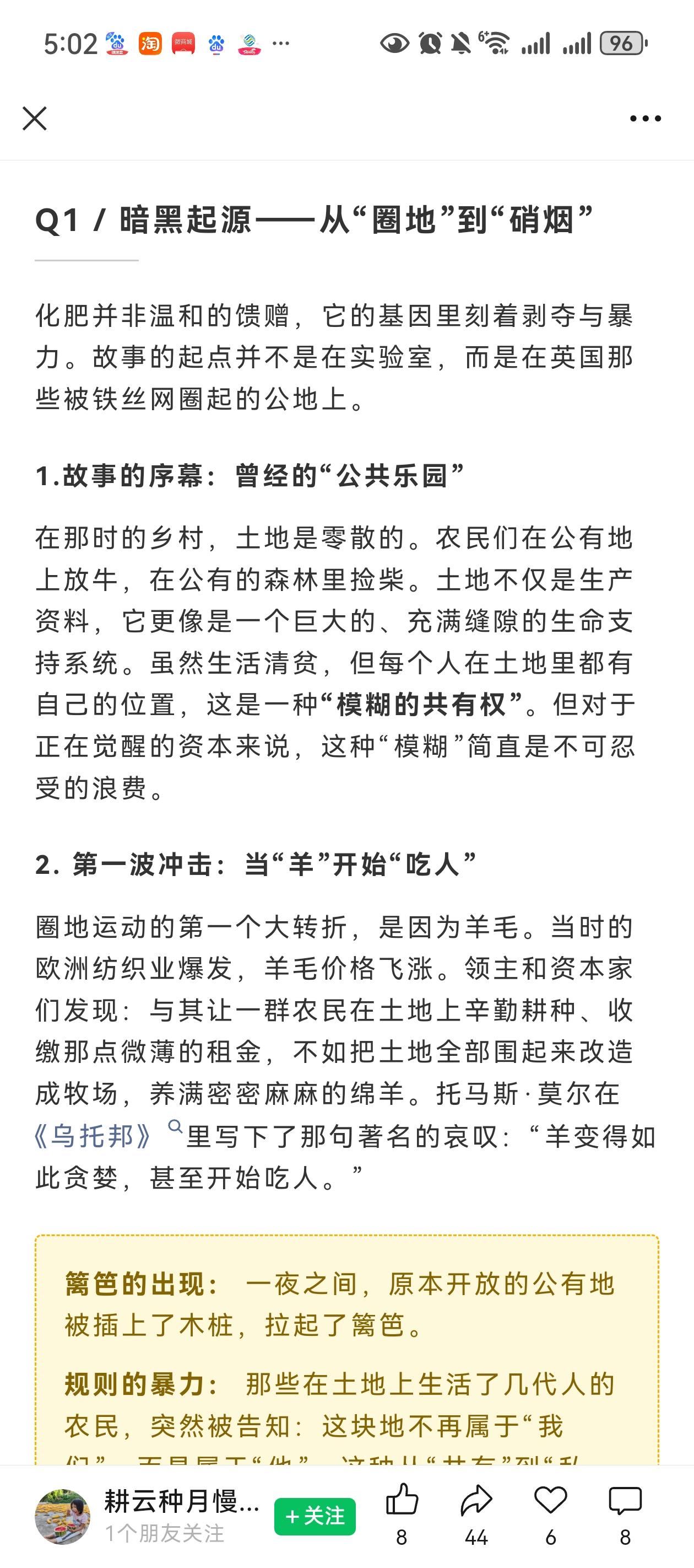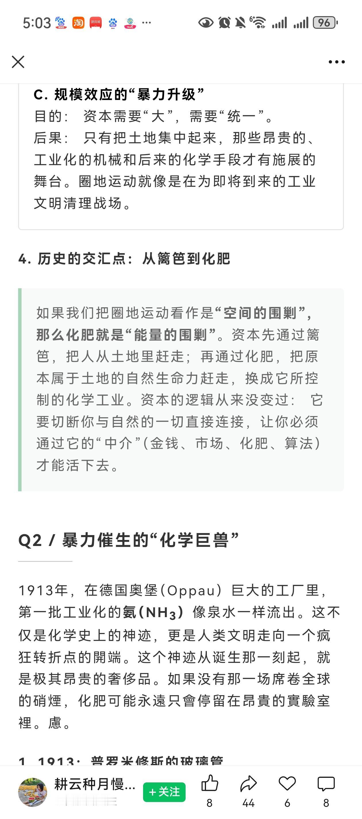 化肥的前身是炸药,农药的前身是战场上神经毒剂,都是军工巨头主导的产品。二次世界大战后,炸药和神经毒剂用途变小了,为了为它们找市场,就用在了农业---炸药的原材料用来生产化肥,神经毒剂直接从战场上撤下来,降低浓度就可以杀虫。至此,二战期间的军用物资完成由战场到农场的华丽转身,还取了个漂亮名字叫“绿色革命”。